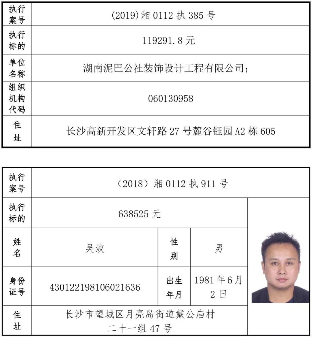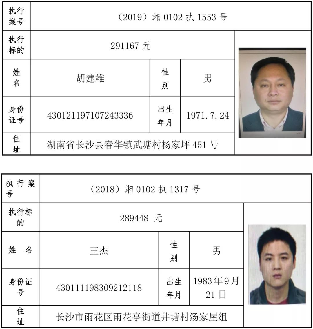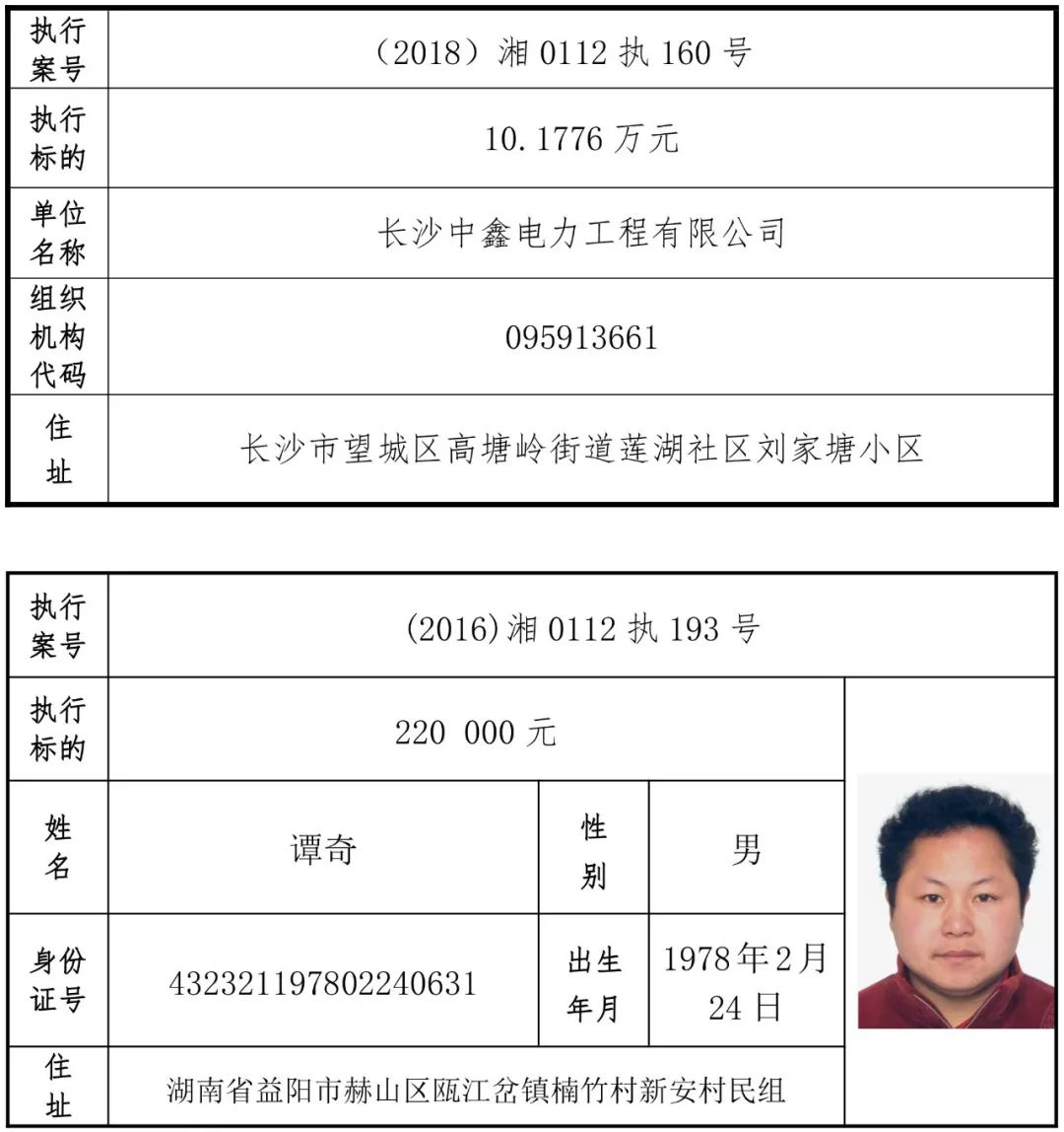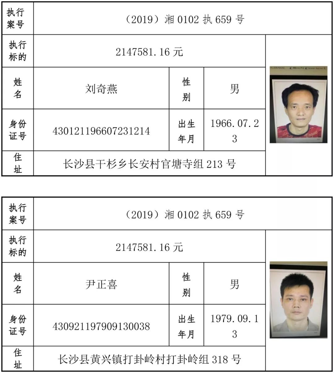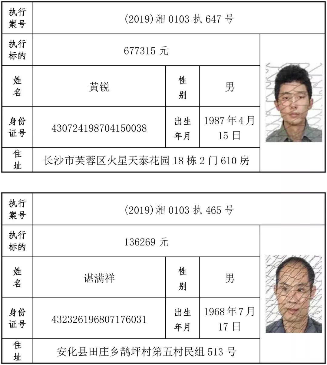 为有效促进被执行人自觉履行生效法律文书确定的义务,维护司法权威,提高司法公信力,让人民群众在每一个司法案件中感受到公平正义,营造向上、向善、诚信互助的社会风尚,促进社会综合治理,加快推进社会信用体系建设,我院根据《最高人民法院关于公布失信被执行人名单信息的若干规定》及《长沙市关于加快推进失信被执行人信用监督、威慑和惩戒联动机制建设的实施意见》,结合长沙市两级法院具体实际,2019年将适时集中统一发布全市两级法院失信被执行人名单信息并予以信用惩戒。现将2019年第一期失信被执行人名单信息予以公布。同时,根据《最高人民法院关于限制被执行人高消费的若干规定》第一条第二款的规定,向该批失信被执行人发布限制高消费令。