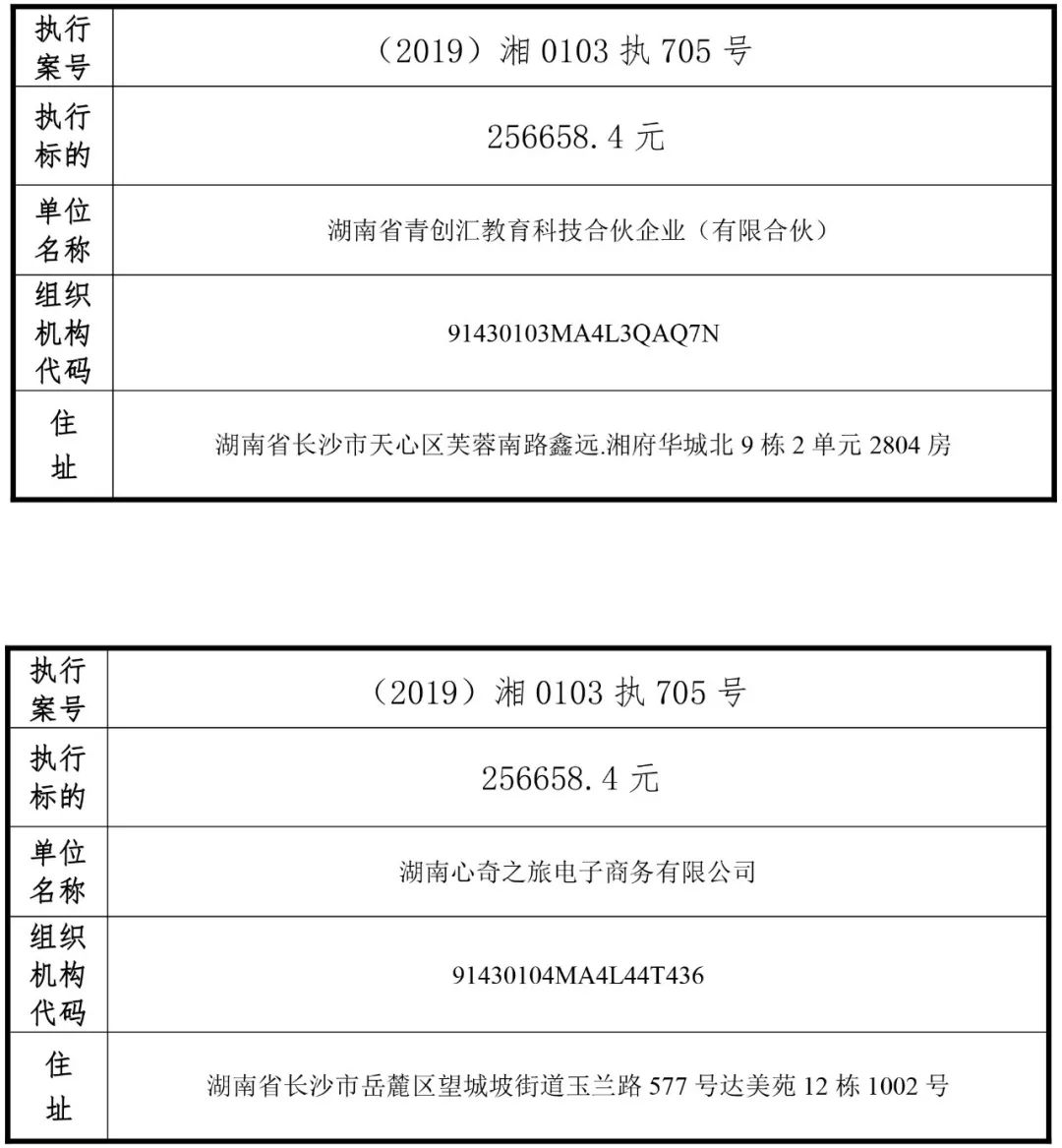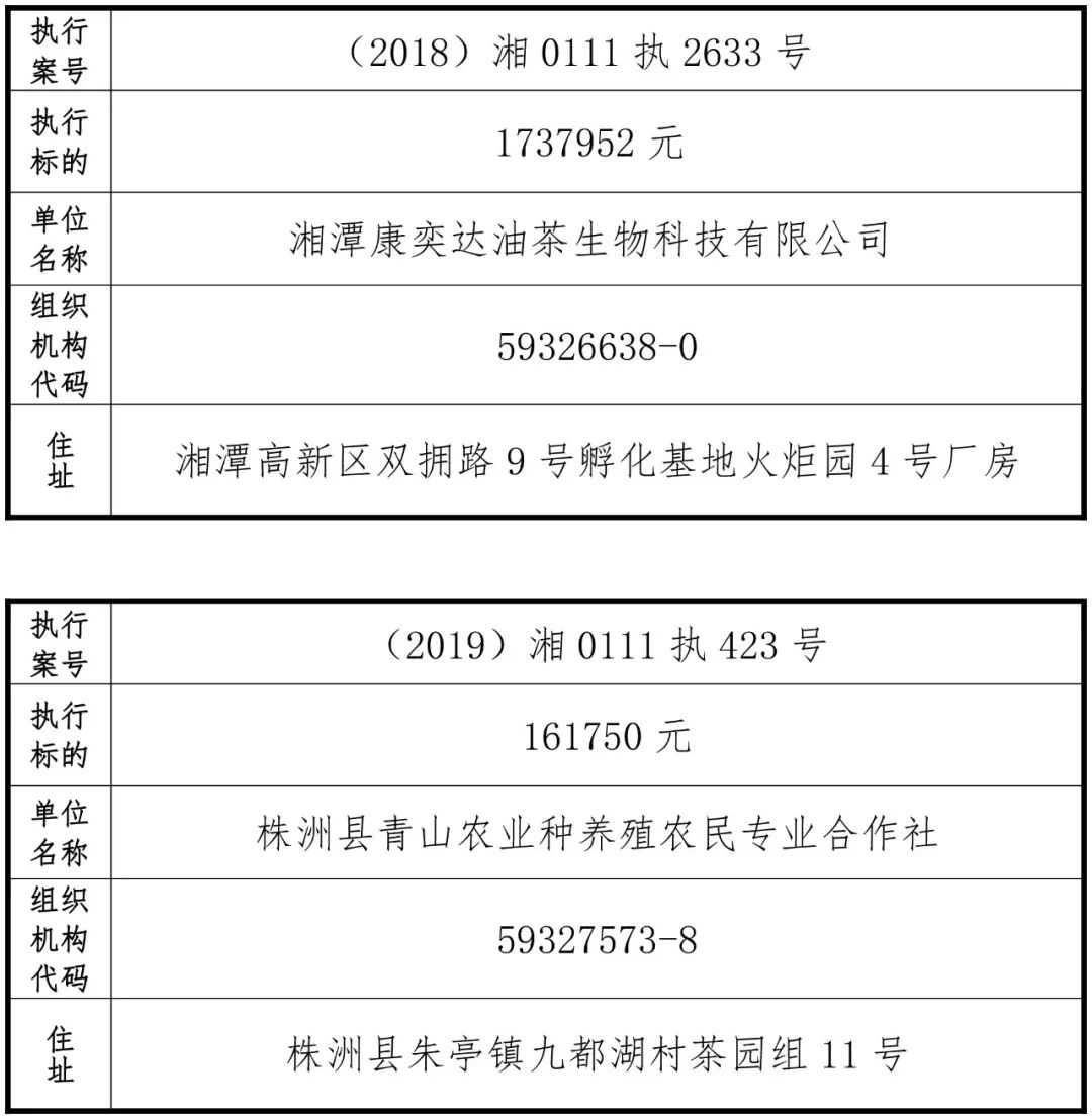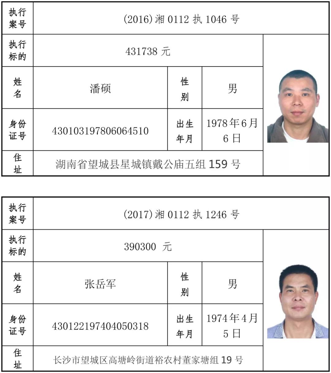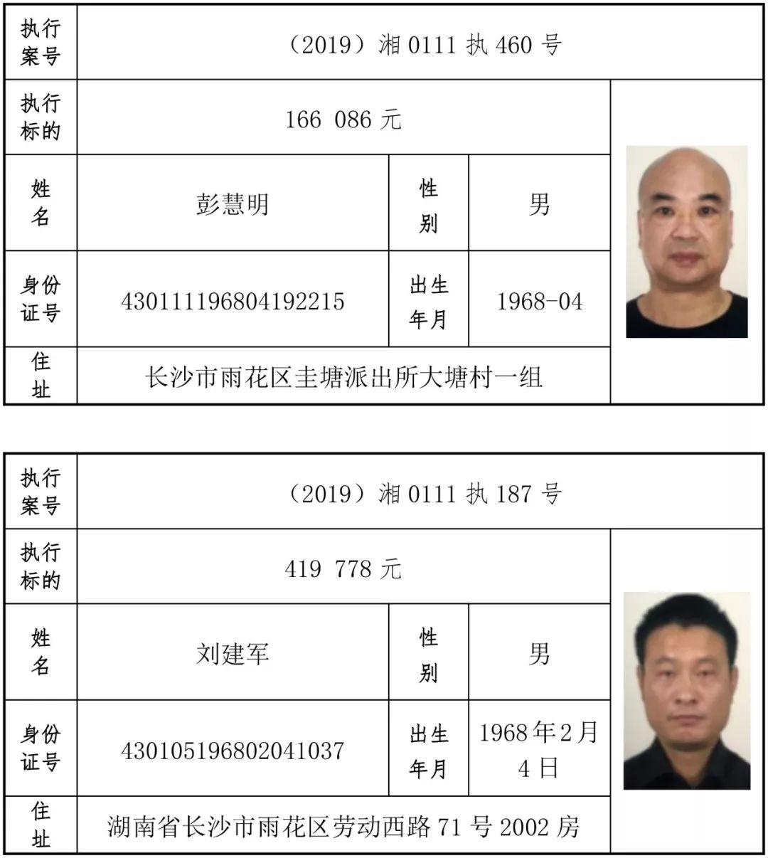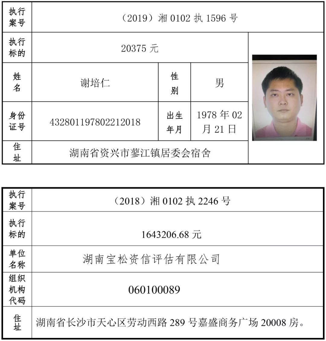为有效促进被执行人自觉履行生效法律文书确定的义务,维护司法权威,提高司法公信力,让人民群众在每一个司法案件中感受到公平正义,营造向上、向善、诚信互助的社会风尚,促进社会综合治理,加快推进社会信用体系建设,我院根据《最高人民法院关于公布失信被执行人名单信息的若干规定》及《长沙市关于加快推进失信被执行人信用监督、威慑和惩戒联动机制建设的实施意见》,结合长沙市两级法院具体实际,2019年将适时集中统一发布全市两级法院失信被执行人名单信息并予以信用惩戒。现将2019年第一期失信被执行人名单信息予以公布。同时,根据《最高人民法院关于限制被执行人高消费的若干规定》第一条第二款的规定,向该批失信被执行人发布限制高消费令。