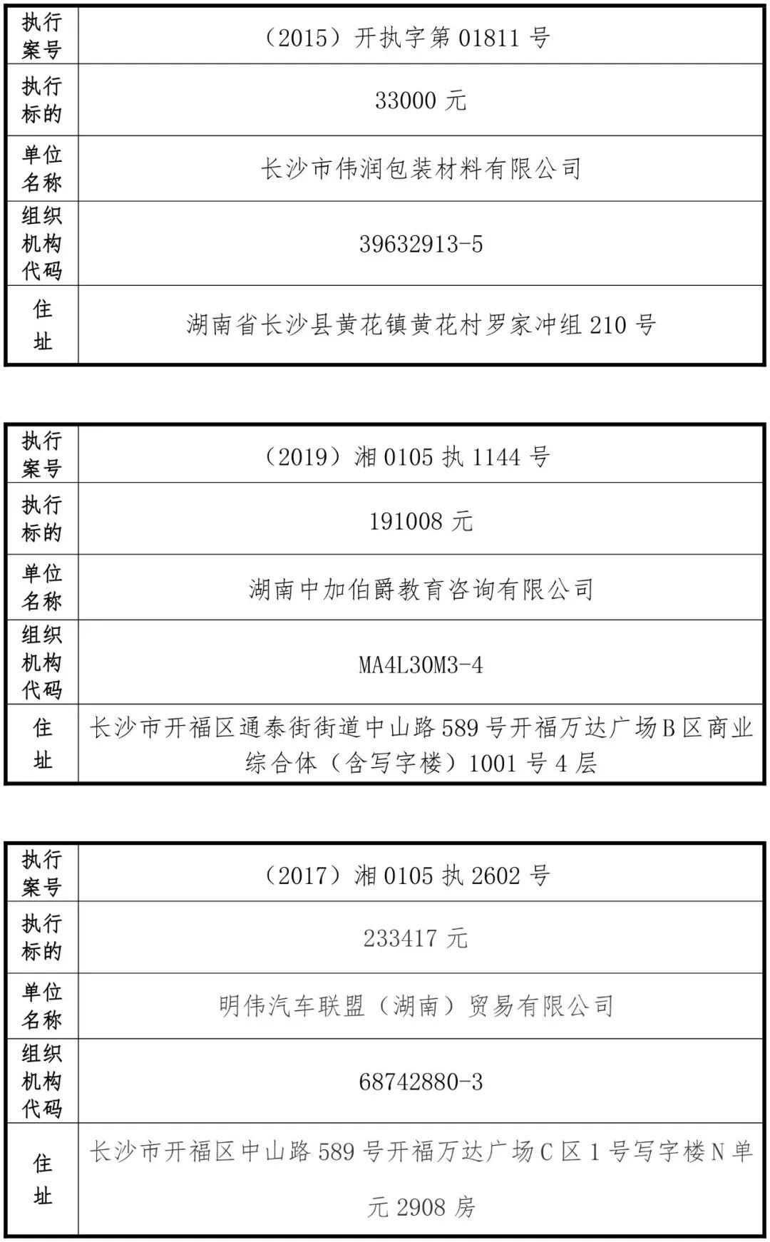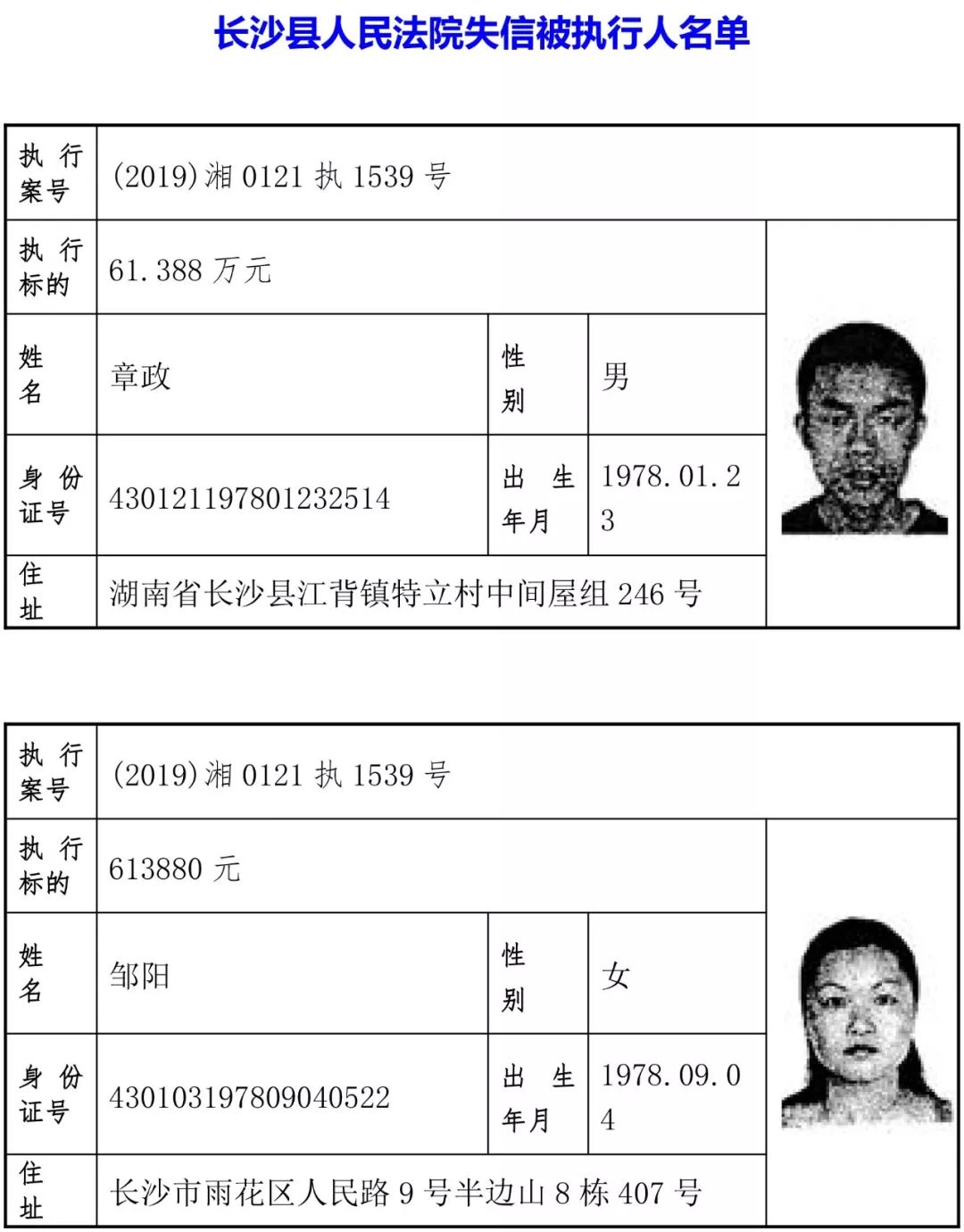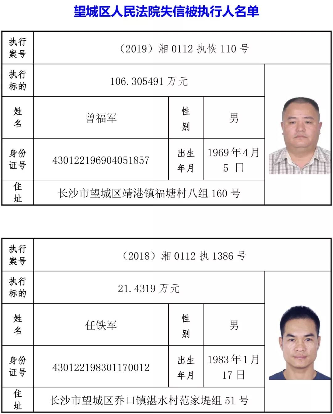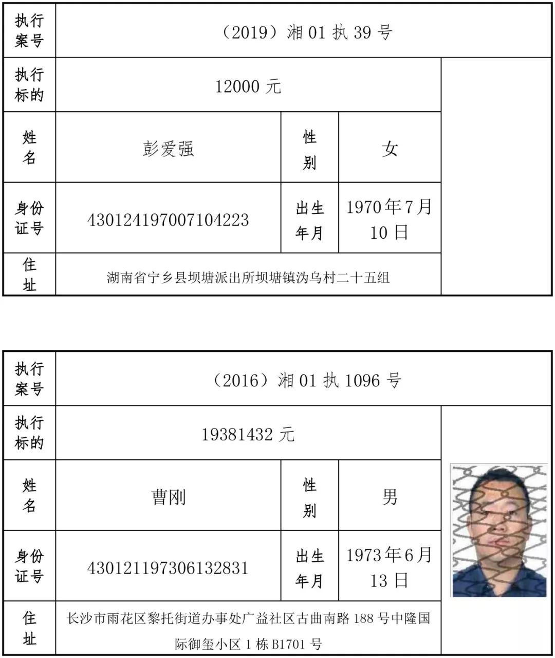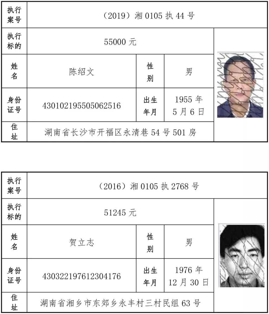为有效促进被执行人自觉履行生效法律文书确定的义务,维护司法权威,提高司法公信力,让人民群众在每一个司法案件中感受到公平正义,营造向上、向善、诚信互助的社会风尚,促进社会综合治理,加快推进社会信用体系建设,我院根据《最高人民法院关于公布失信被执行人名单信息的若干规定》及《长沙市关于加快推进失信被执行人信用监督、威慑和惩戒联动机制建设的实施意见》,结合长沙市两级法院具体实际,2019年将适时集中统一发布全市两级法院失信被执行人名单信息并予以信用惩戒。现将2019年第一期失信被执行人名单信息予以公布。同时,根据《最高人民法院关于限制被执行人高消费的若干规定》第一条第二款的规定,向该批失信被执行人发布限制高消费令。
