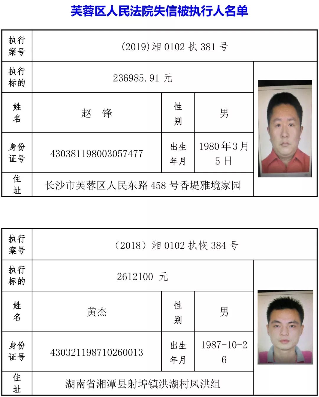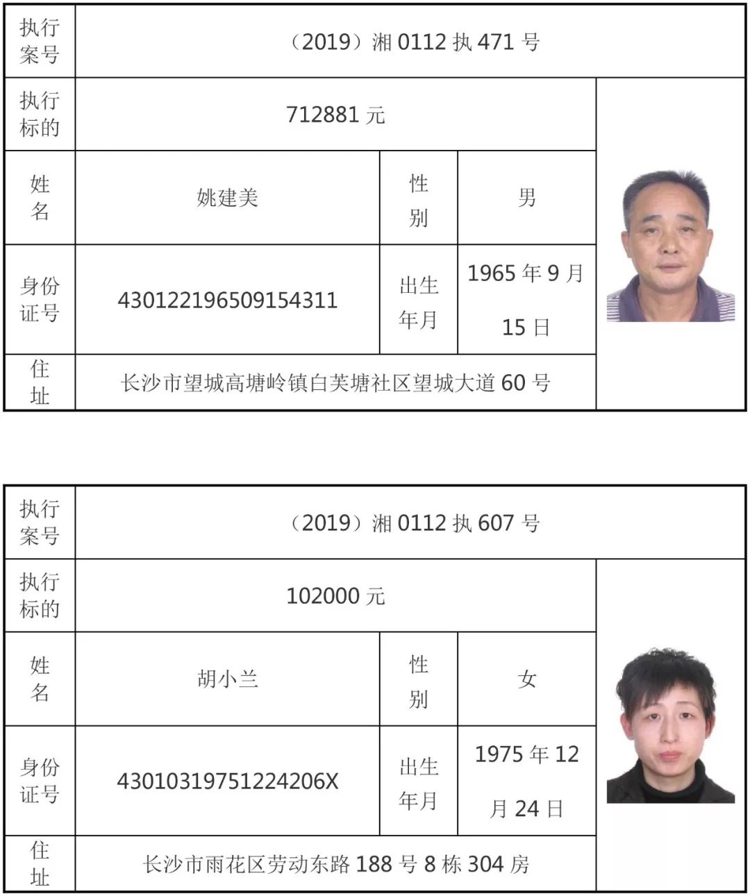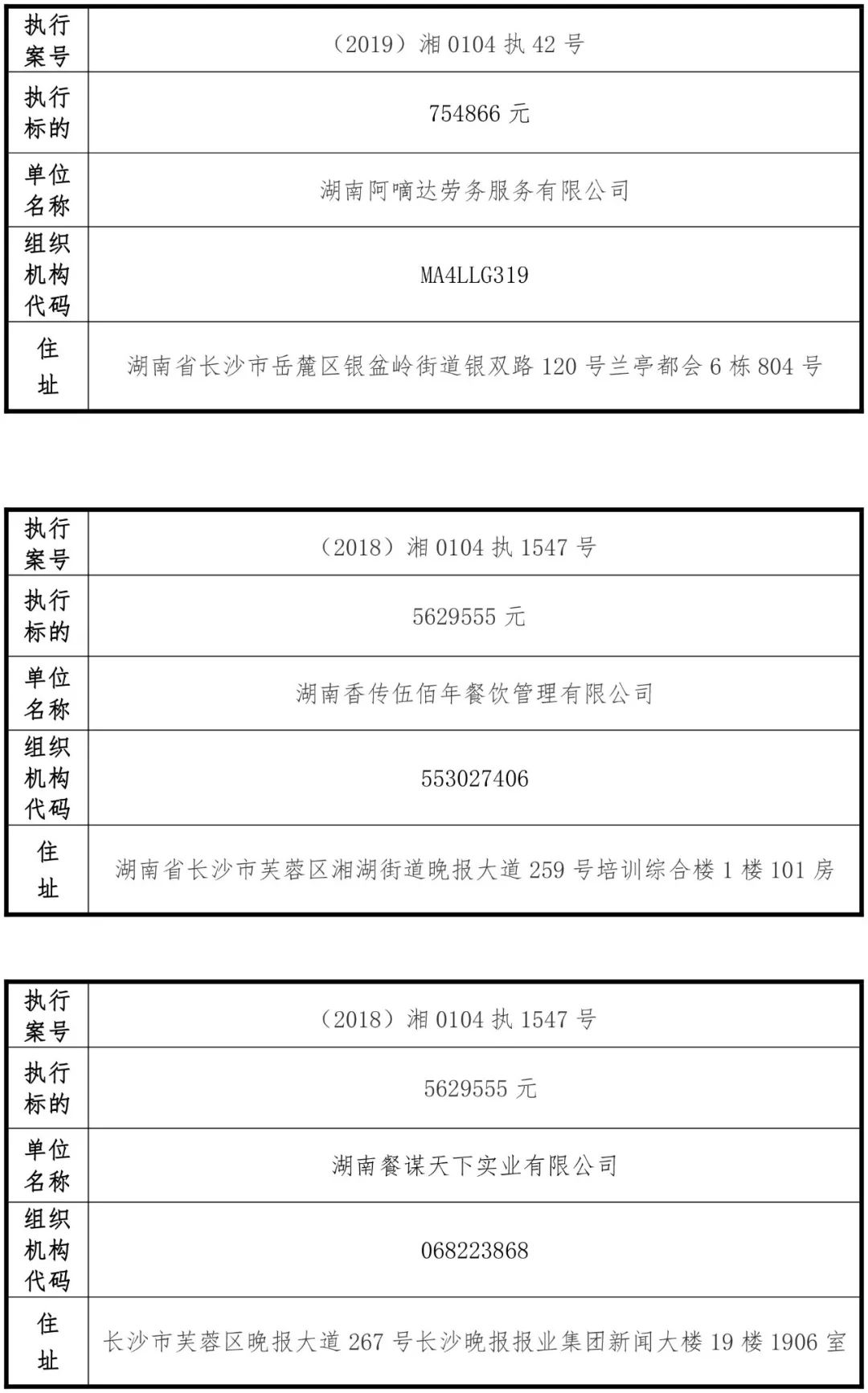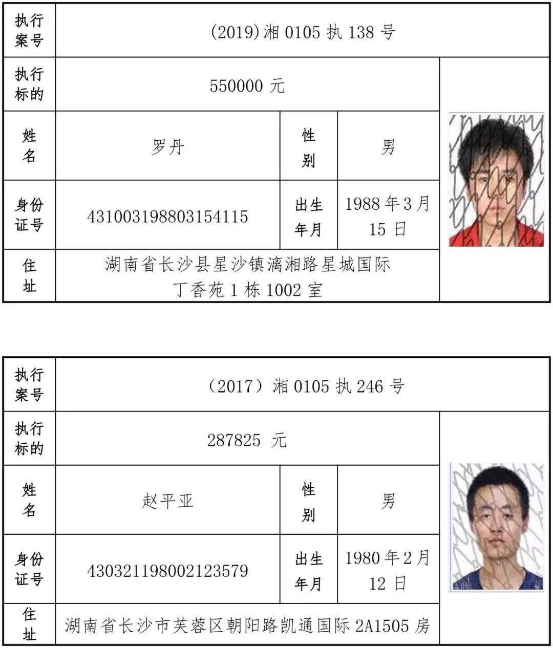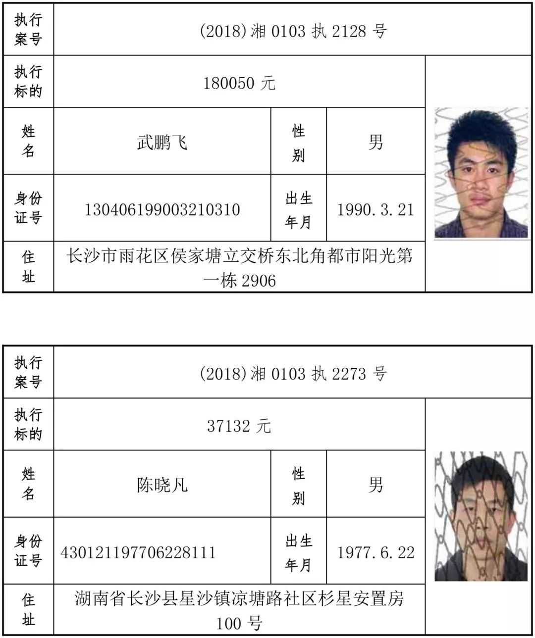为有效促进被执行人自觉履行生效法律文书确定的义务,维护司法权威,提高司法公信力,让人民群众在每一个司法案件中感受到公平正义,营造向上、向善、诚信互助的社会风尚,促进社会综合治理,加快推进社会信用体系建设,我院根据《最高人民法院关于公布失信被执行人名单信息的若干规定》及《长沙市关于加快推进失信被执行人信用监督、威慑和惩戒联动机制建设的实施意见》,结合长沙市两级法院具体实际,2019年将适时集中统一发布全市两级法院失信被执行人名单信息并予以信用惩戒。现将2019年第一期失信被执行人名单信息予以公布。同时,根据《最高人民法院关于限制被执行人高消费的若干规定》第一条第二款的规定,向该批失信被执行人发布限制高消费令。