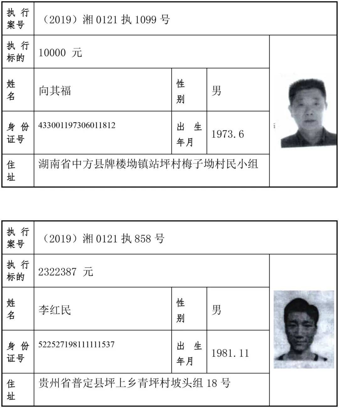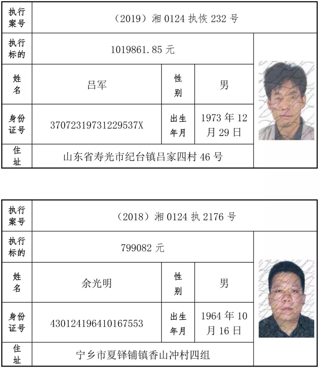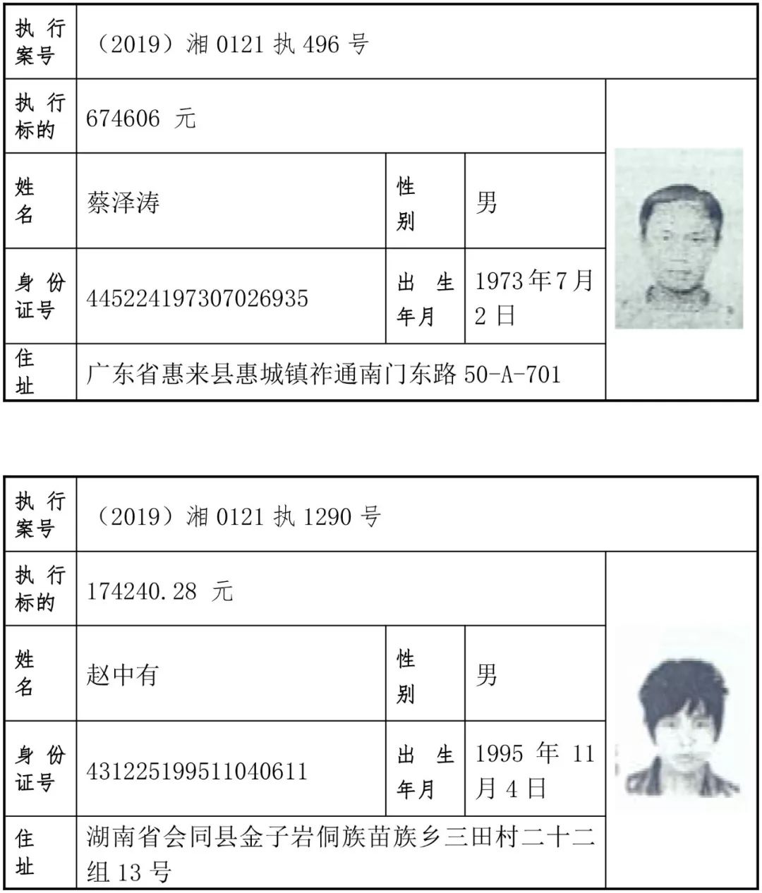 2019年第一批失信被执行人名单信息