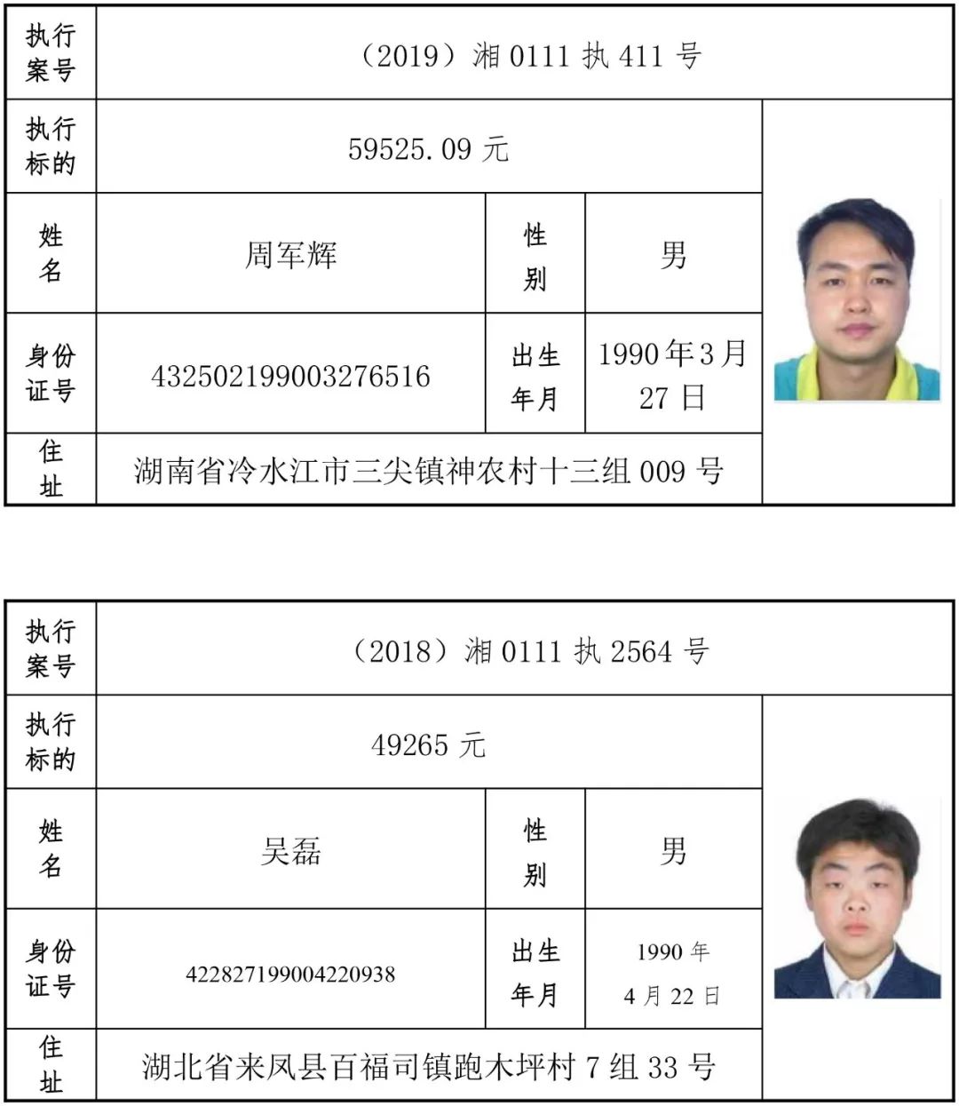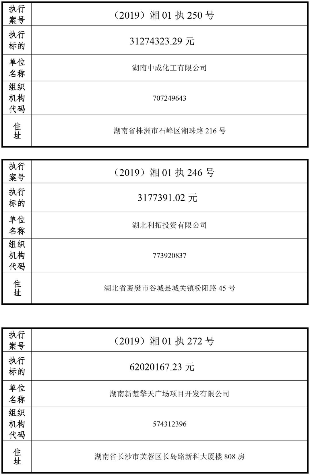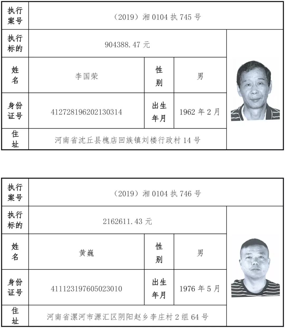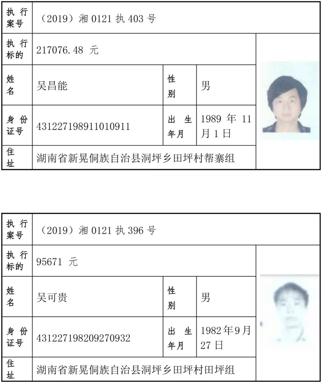 2019年第一批失信被执行人名单信息