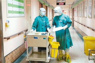 台籍医生林祐成(右)近日在湖南旺旺医院隔离区与护士交谈。
