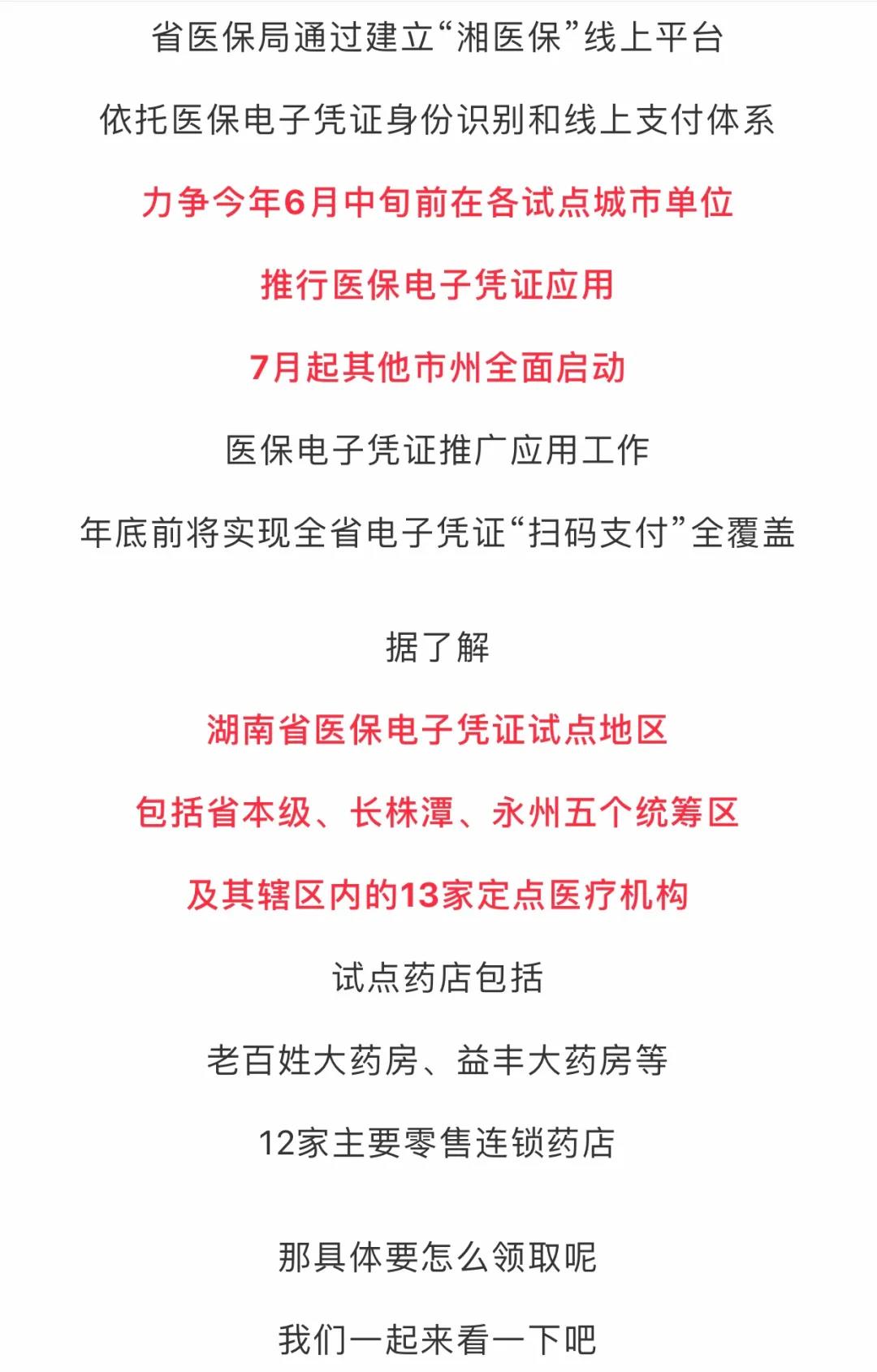 目前,省医保局通过建立“湘医保”线上平台,依托医保电子凭证身份识别和线上支付体系,力争 2020 年 6 月中旬在各试点城市单位推行医保电子凭证应用,7 月起我市也将全面启动医保电子凭证推广应用工作,年底前将实现全省电子凭证“扫码支付”全覆盖,切实解决传统实体卡不能满足群众大量异地和线上服务需求的问题,全面提升医保公共服务能力,让参保人员享受安全、高效、便捷的医保线上服务。电子医保卡领取步疗保障局”微信公众号,点击“微服务”栏目中的“湘医保”,或在对话框回复关键词“电子凭证”,微信骤 关注“怀化市医将自动下发电子医保卡领取网址。