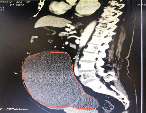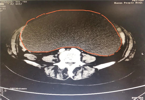 CT显示,巨大的肿瘤几乎占据老人整个盆腔和腹腔。