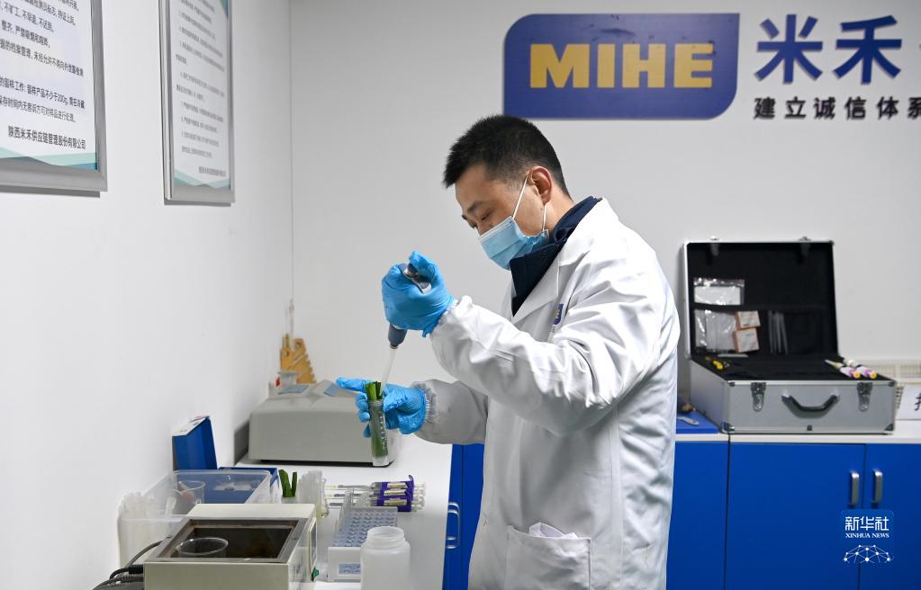 陕西米禾供应链管理股份有限公司的工作人员在进行农残检测(12月19日摄)。新华社记者 刘潇摄