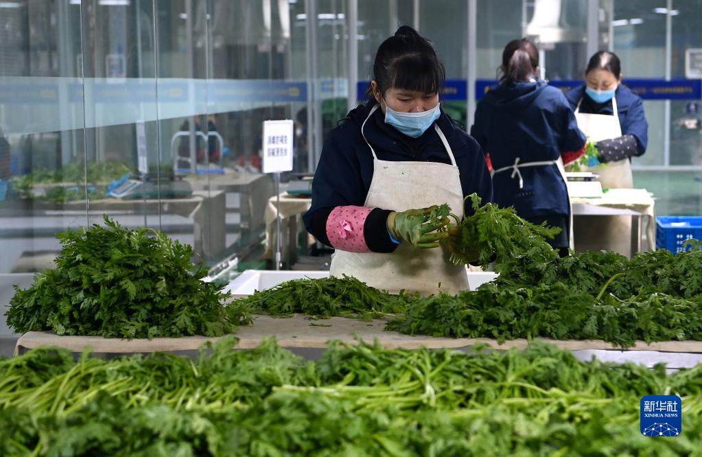 陕西米禾供应链管理股份有限公司的工作人员在分拣蔬菜(12月19日摄)。新华社记者 刘潇摄