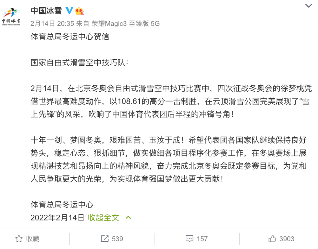 在2月14日晚结束的自由式滑雪女子空中技巧比赛中冬奥会“四朝元老”徐梦桃以108.61的高分夺得金牌实现了中国自由式滑雪空中技巧队沉寂了16年的金牌梦