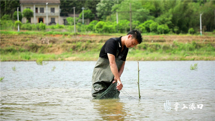 4月24日,烈日骄阳,在淦田镇官塘村小龙虾养殖基地,瘦黑瘦黑的刘吉让穿着下水裤,在水塘里一笼一笼地起着小龙虾。