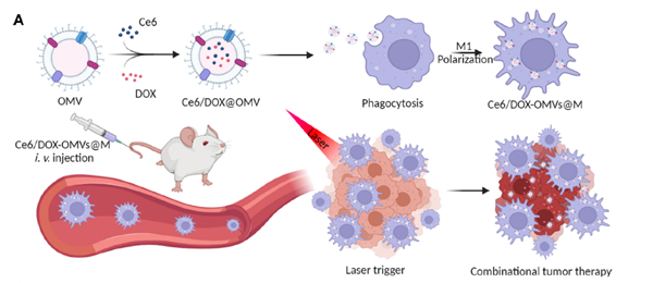 细菌外膜囊泡(OMVs)是由革兰氏阴性菌分泌的天然球形囊泡,粒径在30-250 nm,含有多种病原相关分子模式(PAMPs),如脂多糖、肽聚糖、脂类等,是一种强烈的免疫刺激佐剂,是驱动机体固有免疫的有效因素。多项研究表明将OMVs用于疫苗可以诱导持久的体液和细胞免疫反应。然而,课题组研究发现在原位乳腺癌小鼠中静脉注射OMVs虽然可以一定程度激活免疫达到抗肿瘤目的,但是随着OMVs浓度增加会造成较严重的安全性问题,且单独应用OMVs抗肿瘤疗效有限。