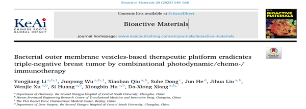 近日,湖南省转化医学与创新药物工程技术研究中心主任、湘雅二医院药学部向大雄教授团队在纳米药物治疗肿瘤领域取得最新研究进展,在生物材料国际期刊《Bioactive Materials》(2021 IF=16.874,JCR1区)上发表题为“Bacterial outer membrane vesicles-based therapeutic platform eradicatestriple-negative breast tumor by combinational photodynamic/chemo-/immunotherapy”的研究。论文第一作者及通讯作者单位均为中南大学湘雅二医院,向大雄教授为通讯作者,团队2019级博士研究生李泳江、吴军勇博士为共同第一作者。