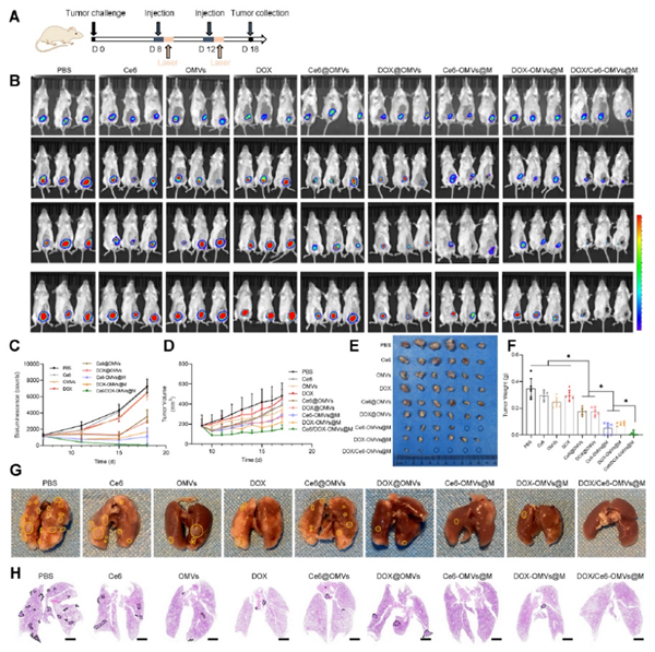 基于以上问题,课题组应用OMVs包载了化疗药物阿霉素(DOX)和常用的光敏剂Ce6,同时利用单核巨噬细胞肿瘤靶向和病原体吞噬原理将其作为“便车”搭载OMVs,构建了一种载OMVs巨噬细胞递药系统Ce6/DOX-OMVs@M用于靶向治疗乳腺癌。研究结果表明Ce6/DOX-OMVs@M可精确靶向至小鼠原位乳腺癌,经660 nm波长光照后巨噬细胞发生破裂释放载药OMVs,可极大增加OMVs的体内安全性。其中OMVs可重编程肿瘤巨噬细胞为M1型(抗肿瘤作用),同时引起肿瘤细胞焦亡释放炎症炎子,将“冷肿瘤”转变为“热肿瘤”,进一步增强免疫效应。与此同时,Ce6经光照后产生活性氧ROS,化疗药物DOX可进一步杀伤肿瘤细胞,达到“一石三鸟(光动力-化疗-免疫治疗)”目的,只需两次给药即可有效杀灭肿瘤且避免肿瘤细胞肺转移。本研究是在细菌及其分泌外膜囊泡用于肿瘤免疫治疗上的重要尝试和新的突破,构建的巨噬细胞给药系统可有效增加OMVs的安全性和肿瘤靶向性,为开发OMVs作为疫苗平台提供了新的思路。