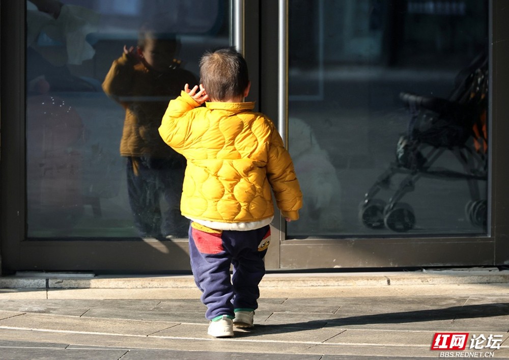 在城市的缝隙里,生命以最自然的形态舒展。广场上,老人伸展双臂,幼童蹒跚效仿,那一刻的光影是跨越岁月的重合;落地窗前,裹着黄色羽绒服的小生命正好奇地与倒影对话,这种纯粹的探索欲,是城市里最轻盈的呼吸。