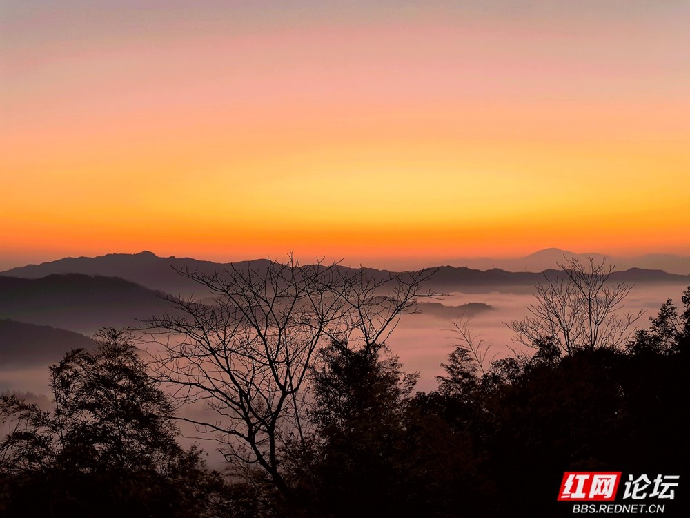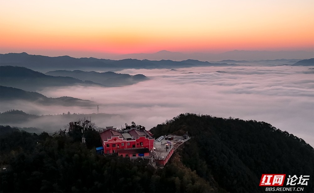 然而,在向导的极力推荐下,12月9日的清晨,我们意外收获了另一份大自然的馈赠。在那幕阜山脉西南角的将军山顶,当第一缕曙光刺破晨雾,漫无边际的云海如潮水般在脚下翻涌。远山在云涛中若隐若现,宛如孤岛;那座红墙黛瓦的古筑屹立于巅峰,在金色的霞光与紫色的天光交织中,显得神圣而庄严。这一刻,将军山的雄奇与汨罗江的温婉在心中交汇,不禁感叹:此行寻鸟,却误入仙境,平江之美,果真气象万千。(图文/红网论坛@凯哥一曲)