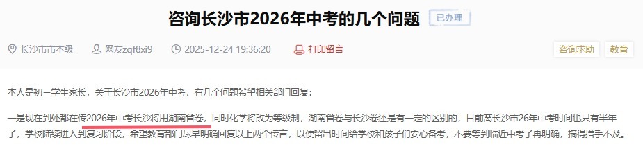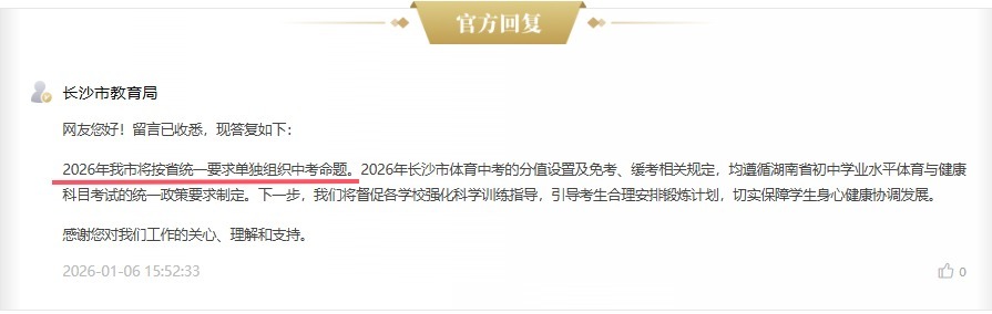 日前,湖南省教育考试院印发《湖南省初中学业水平考试试卷结构(2025年修订)》,明确2026年中考将实行四科开卷、题型分值调整等多项改革举措(2026湖南中考试卷安排来了!四科开卷,题型分值有调整),这一方案的发布引发长沙家长的关注:长沙中考是否会启用湖南省卷呢?近日,长沙市教育局回应热点关切:2026年长沙中考将继续保持单独命题模式,试题结构遵循“总体稳定,适当微调”原则。