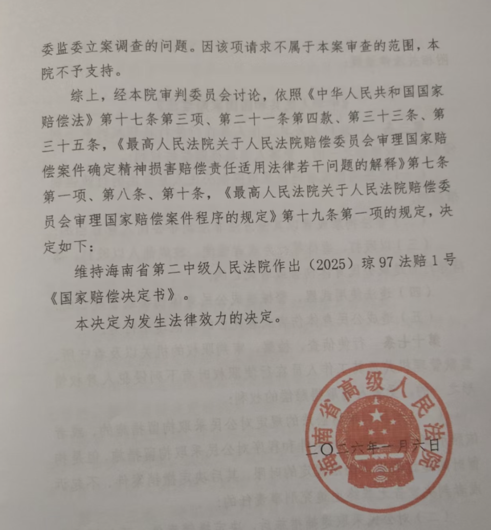 杨昌武向记者表示,2026年1月6日海南高院的工作人员到他家中,当面送达了该院作出的国家赔偿决定书。