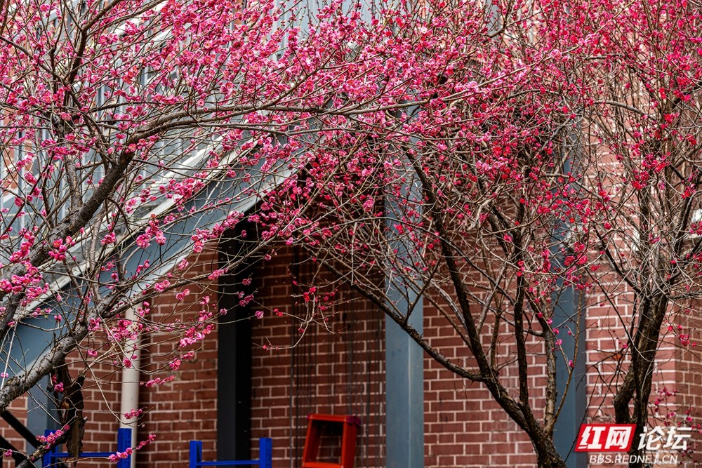 那一簇簇深粉色的花苞在虬劲的枝头悄然绽放,有的繁花满树,如云蒸霞蔚;有的独处一隅,尽显疏影横斜的雅致。在百年红砖与拱门长廊的衬托下,梅花的清幽与建筑的厚重相得益彰。游人穿行其间,或驻足凝望,或举起手机定格这份“梅”好。这不仅是自然季节的更迭,更是历史积淀与生机春意的一次浪漫邂逅。