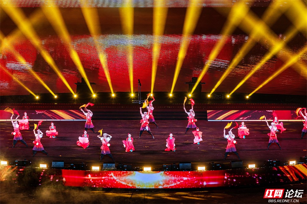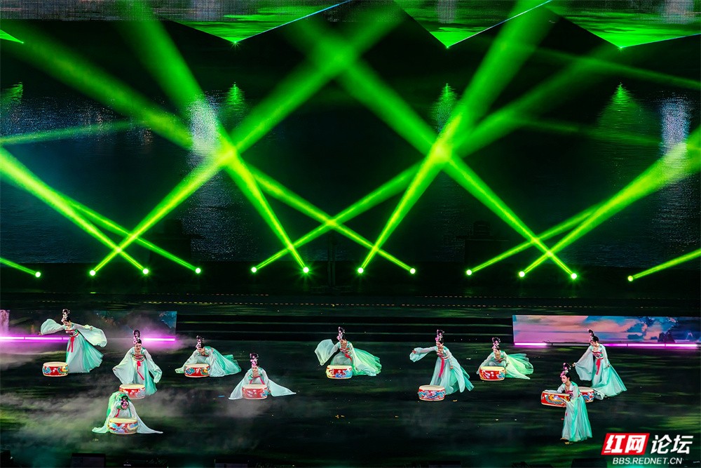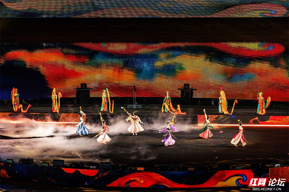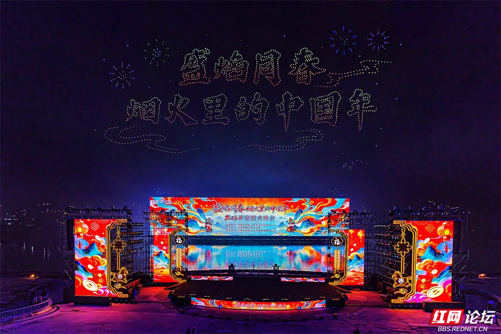 夜幕为幕,河水为台,浏阳“盛焰同春·烟火里的中国年”2026新春焰火晚会在天空剧院璀璨启幕。无人机编队划破夜空,以光为笔,拼写出“盛焰同春”的晚会主题,与地面流光溢彩的舞台遥相呼应。舞台之上,国风舞姿翩跹而起——红衣舞者踏歌而舞,青衣佳人鼓乐和鸣,飞天霓裳在流转的彩光中轻盈舒展,传统韵味与现代光影于此完美交融。