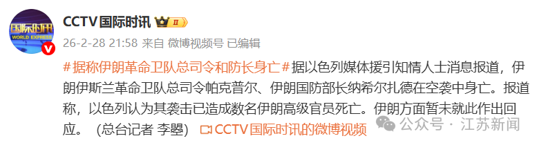 CCTV国际时讯据以色列媒体援引知情人士消息报道,伊朗伊斯兰革命卫队总司令帕克普尔、伊朗国防部长纳希尔扎德在空袭中身亡。报道称,以色列认为其袭击已造成数名伊朗高级官员死亡。