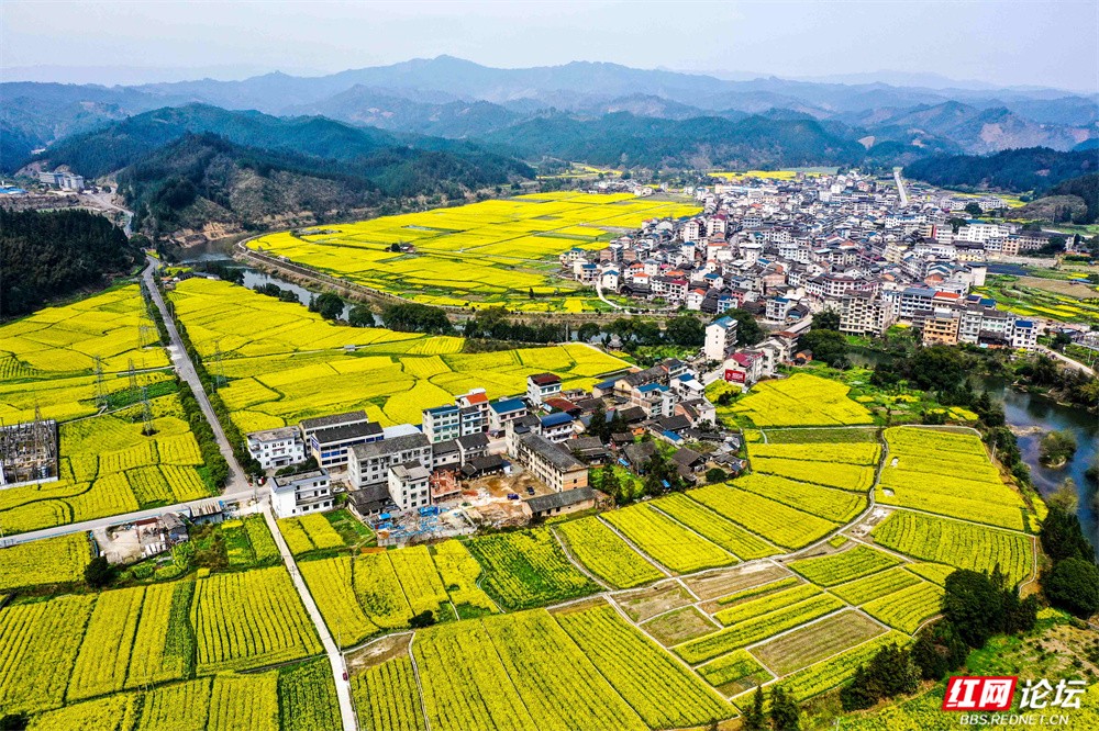 进入洪州,放眼皆是漫野的金黄。蜿蜒的河水静静环抱着村落,将大片黄绿交织的油菜田轻柔划开。远处青山如黛,层峦叠翠,时有薄雾轻笼,为这明媚春色蒙上一层朦胧的诗意。灰瓦白墙的民居错落其间,小桥、公路点缀其中,静动相宜,宛如一幅浑然天成的乡村画卷。