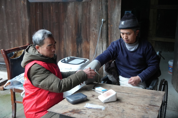 在对溪社区,志愿者俞荷像往常一样开展日常走访,在与居民交流中得知,双腿截肢的二级残疾人谢建新受到连日来阴雨天气影响,日常出行不便,就医、测血压、取药都存在困难。了解情况后,俞荷第一时间联系社区医护人员,上门为谢建新测量血压、检查身体,详细了解其用药需求,并耐心叮嘱用药注意事项和日常保健知识。一句句贴心问候、一次次上门帮扶,让谢建新真切感受到来自社区志愿者的关怀。
