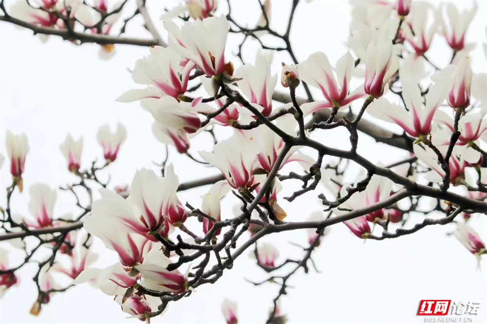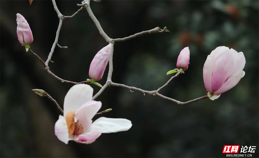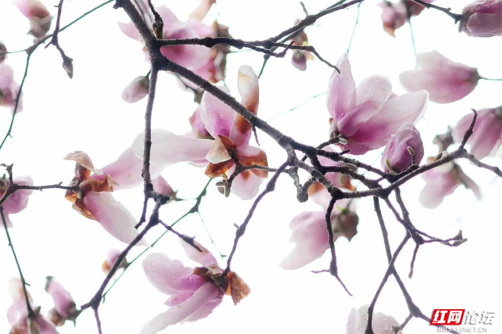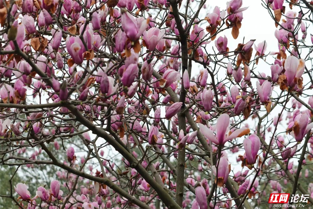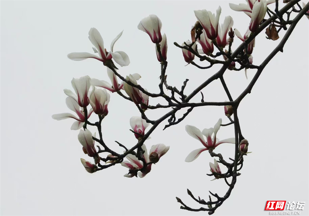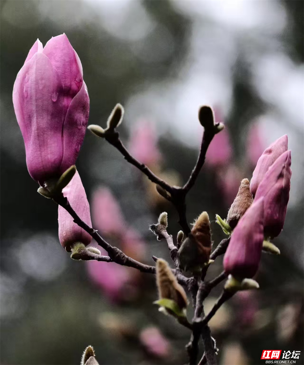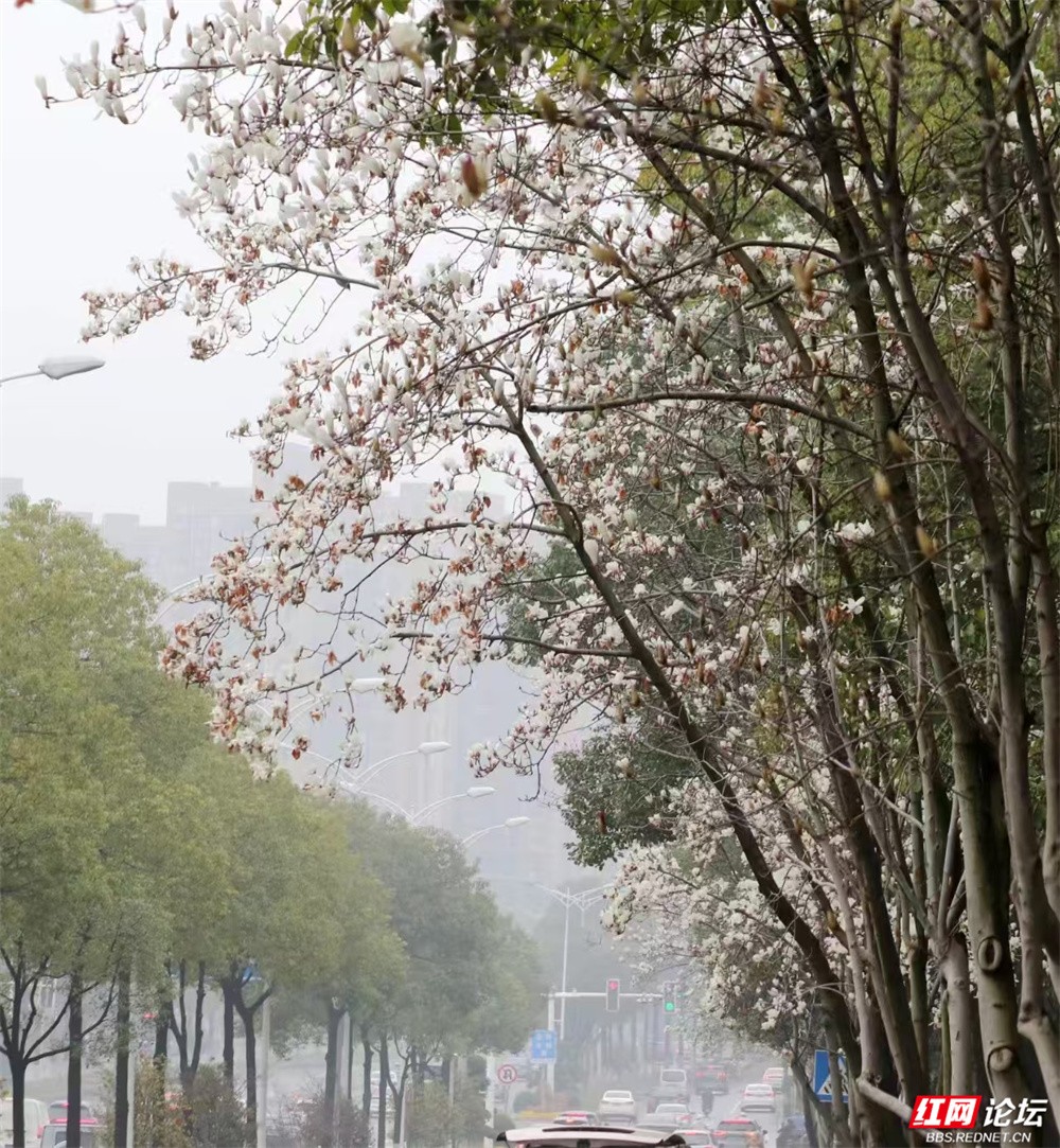 长沙的春,总在细雨里悄然舒展。金星中路的玉兰又盛放了——白的像凝脂缀雨,清冷皎洁;粉的似胭脂匀淡,羞答答打着朵儿;紫红的则如水墨里漾开的霞,在深褐枝头低低燃着。