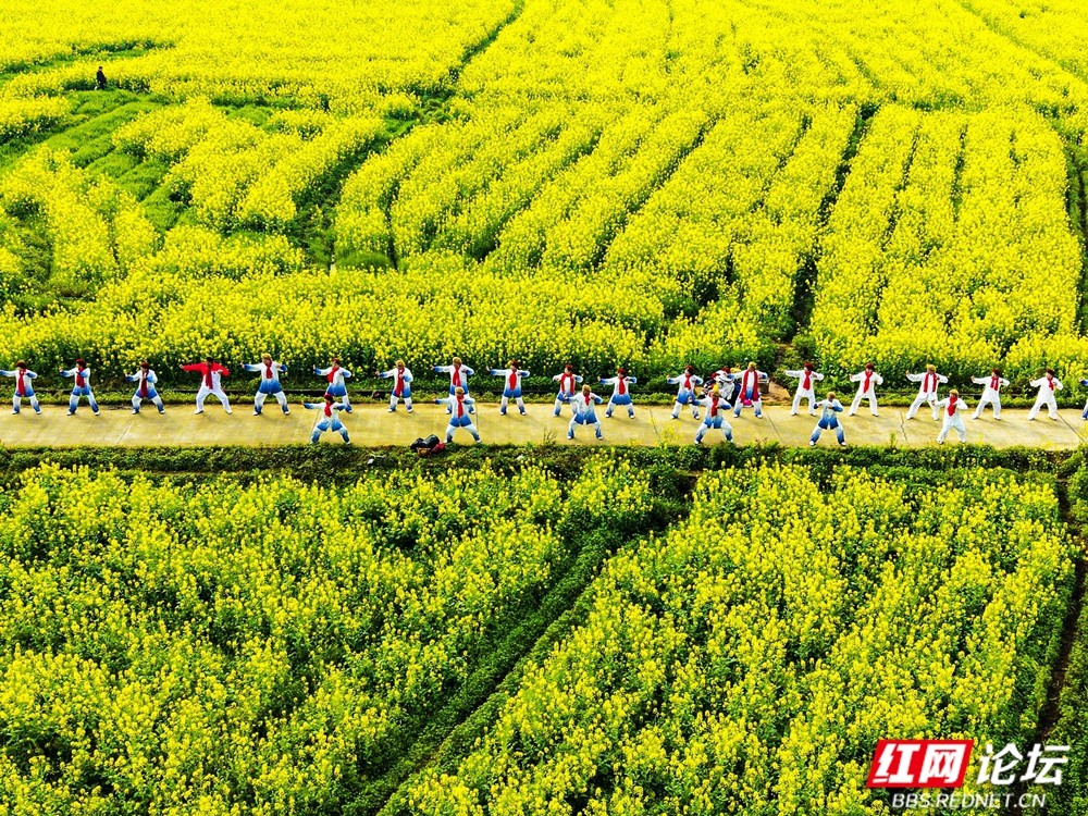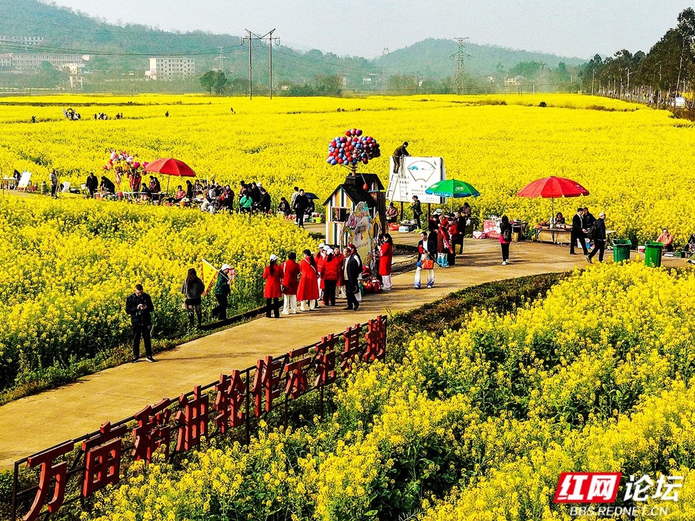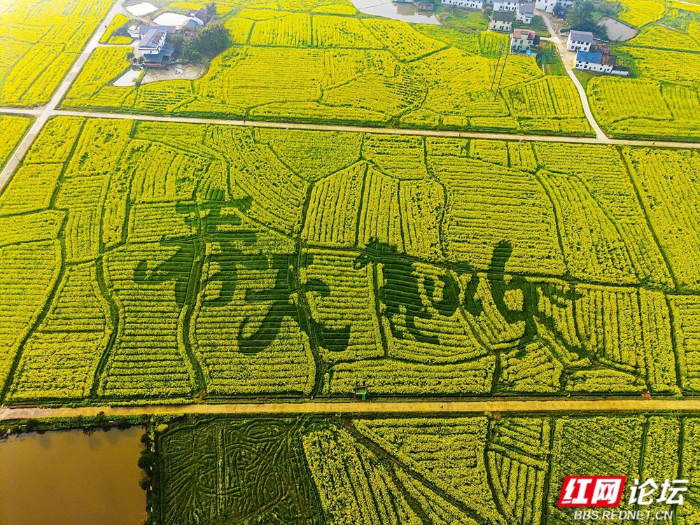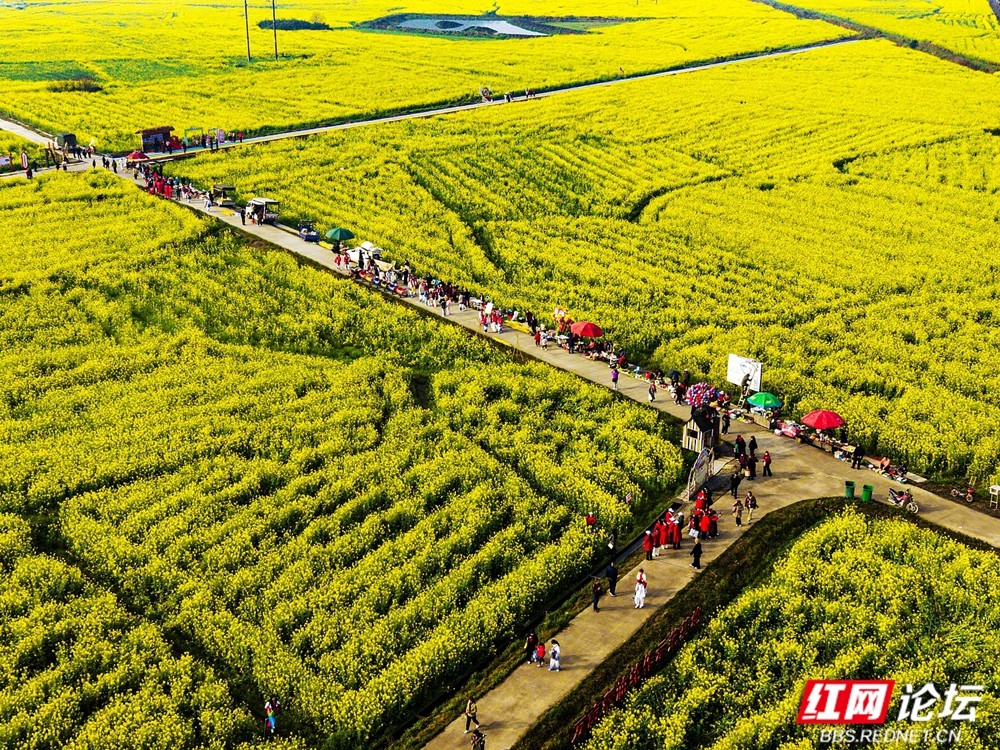 三月春风起,资兴市蓼江镇万亩油菜花竞相绽放。连片金波与远山、白墙、溪流交织成画,高空俯瞰,“春天2026”景观与彩虹步道点缀其间,现代活力与田园诗意完美融合,吸引无数游客沉醉于这片“大地锦绣”。