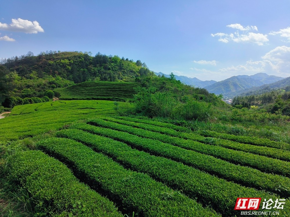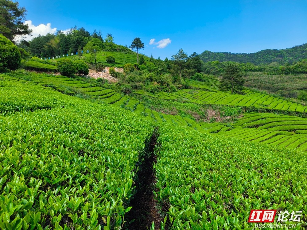 漫步于古楼坡,镜头所及皆是风景。层层叠叠的茶园绿意盎然,宛如一条条碧绿的绸带。整齐划一的茶垄顺着陡峭的山势蜿蜒铺展,仿佛大地的指纹,记录着勤劳与汗水。它们与头顶浩瀚的蓝天、四周苍翠的松林交相辉映,构成了一幅生机勃勃、和谐共生的生态画卷。那泥土与新芽的芬芳弥漫在空气中,让人仿佛能触摸到大山的呼吸。