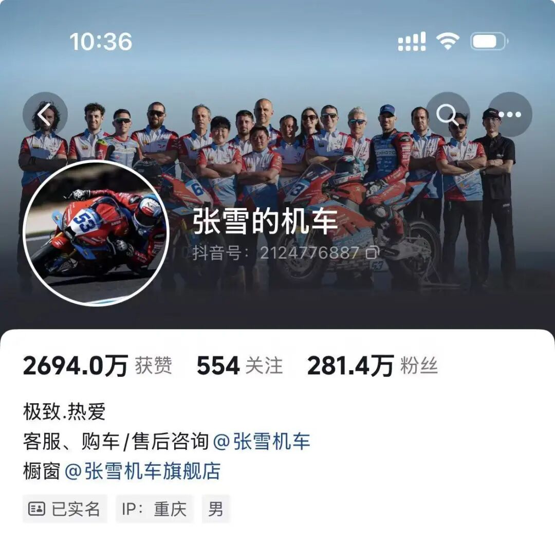 截至4月1日上午10时36分,“张雪的机车”抖音账号粉丝数已达到281.4万,对比3月28日,3天涨粉达到133.6万。