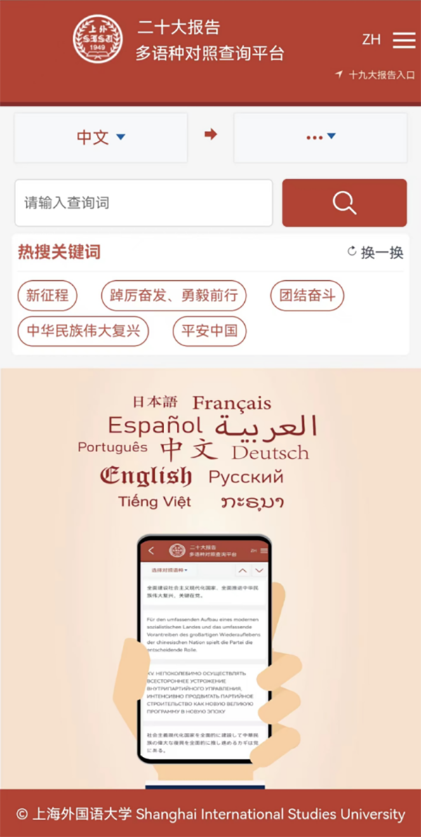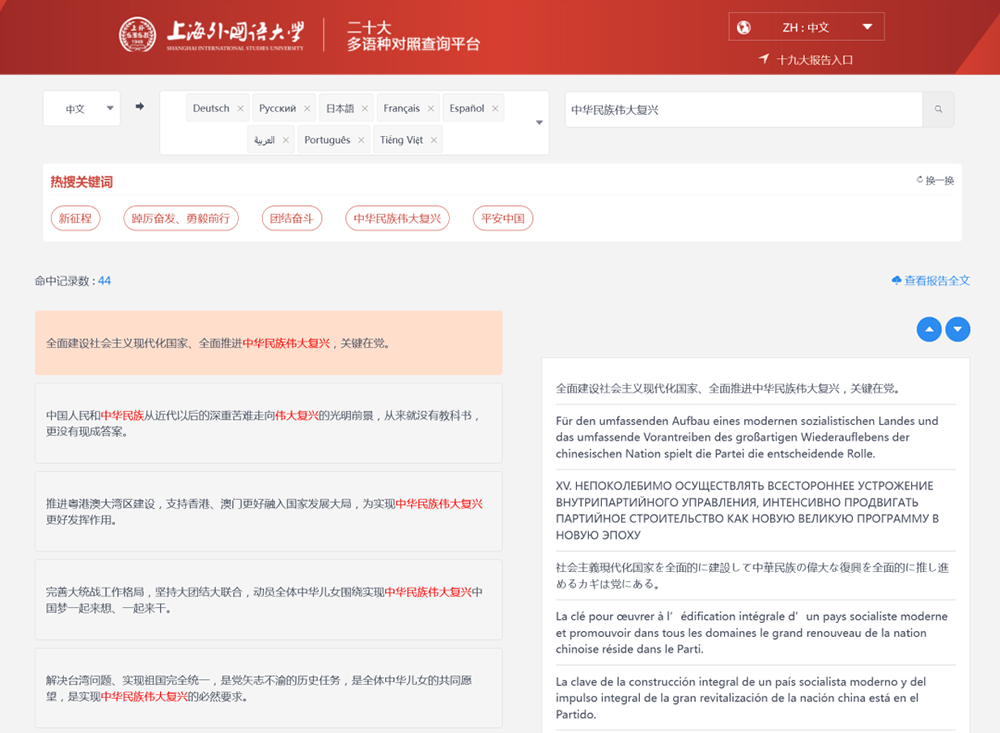 为了更好地让海内外了解、研究党的二十大精神,近日,上海外国语大学充分发挥外国语言文学领先的学科优势,以及多语种学术资源,推出了包含11个语种的“二十大报告多语种对照查询平台”。