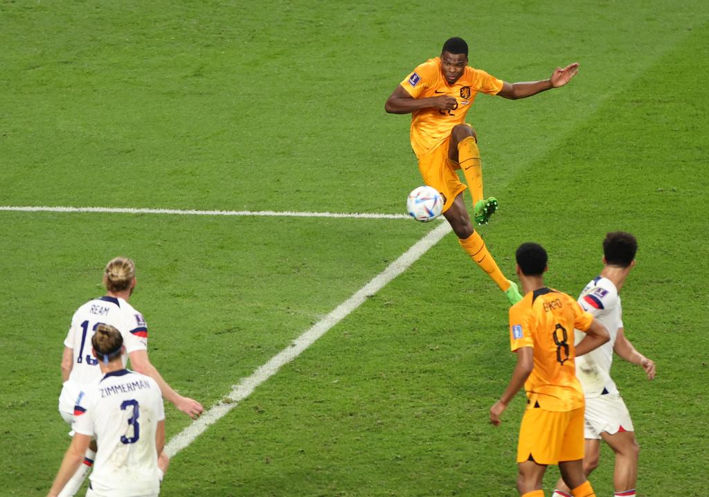 12月3日,荷兰队球员丹泽尔·邓弗里斯(上)在比赛中破门得分。新华社记者 贾浩成 摄