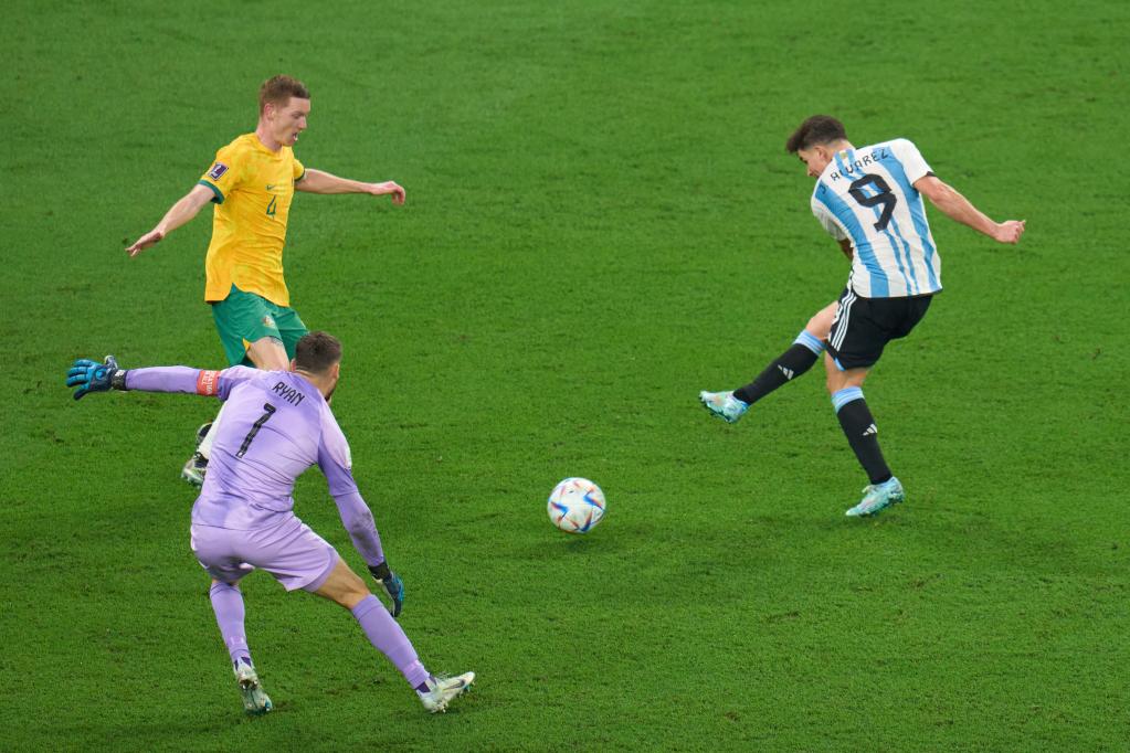 12月3日,阿根廷队球员阿尔瓦雷斯(右)在比赛中进球。新华社记者 孟鼎博 摄