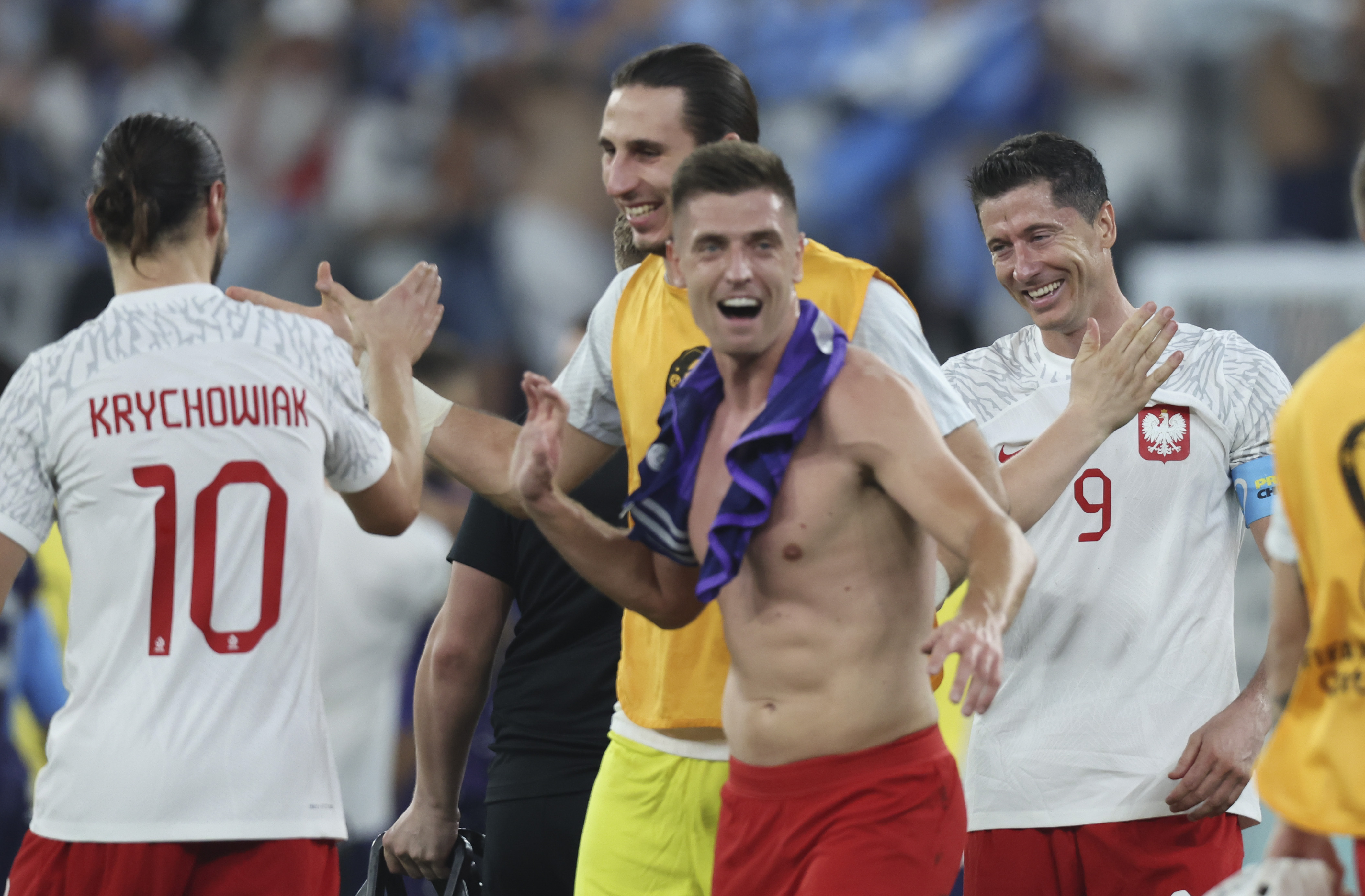 11月30日,波兰队球员莱万多夫斯基(右一)在比赛后与队友庆祝。新华社记者 曹灿 摄