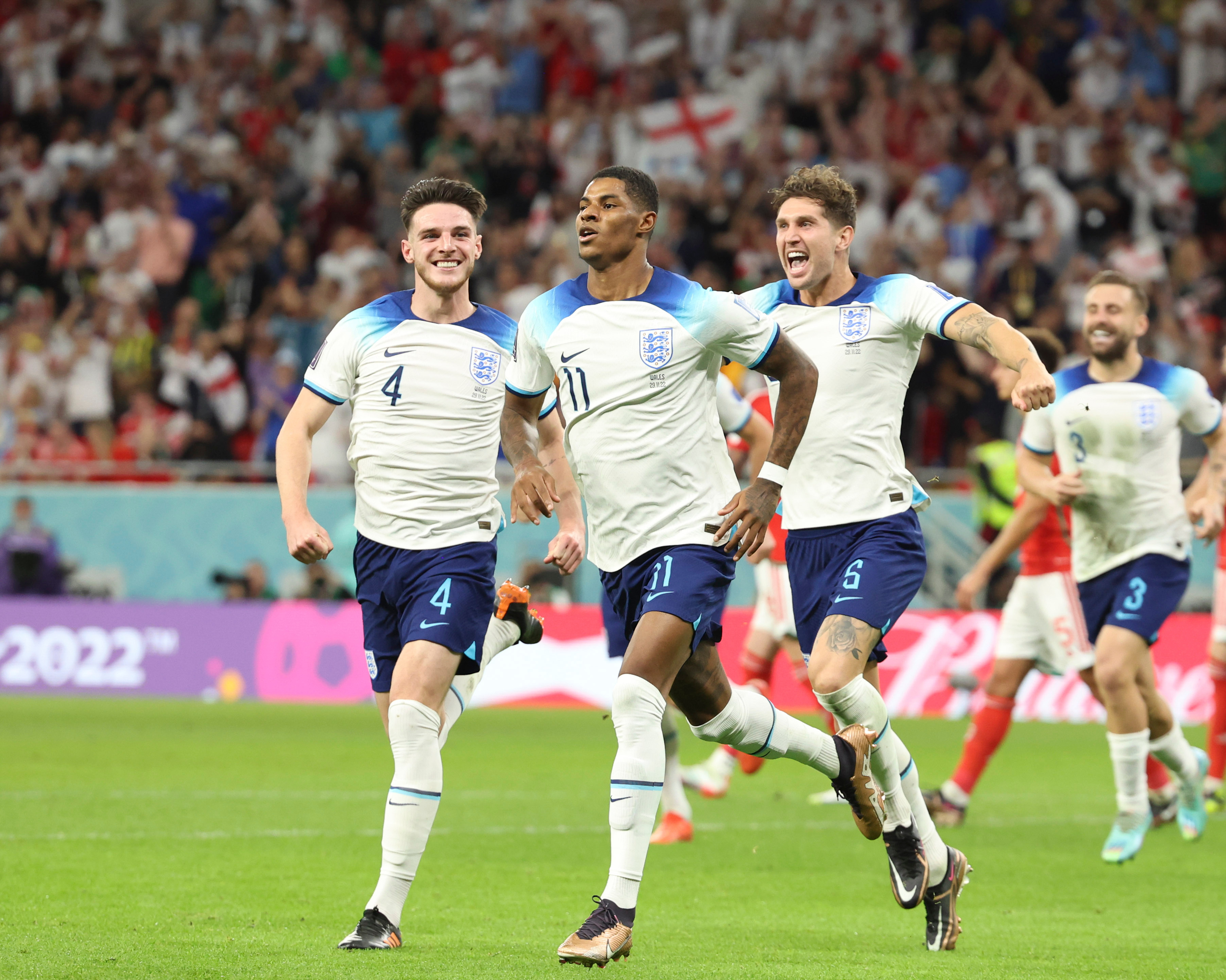 11月29日,英格兰队球员拉什福德(前中)在比赛中进球后庆祝。新华社记者 韩岩 摄