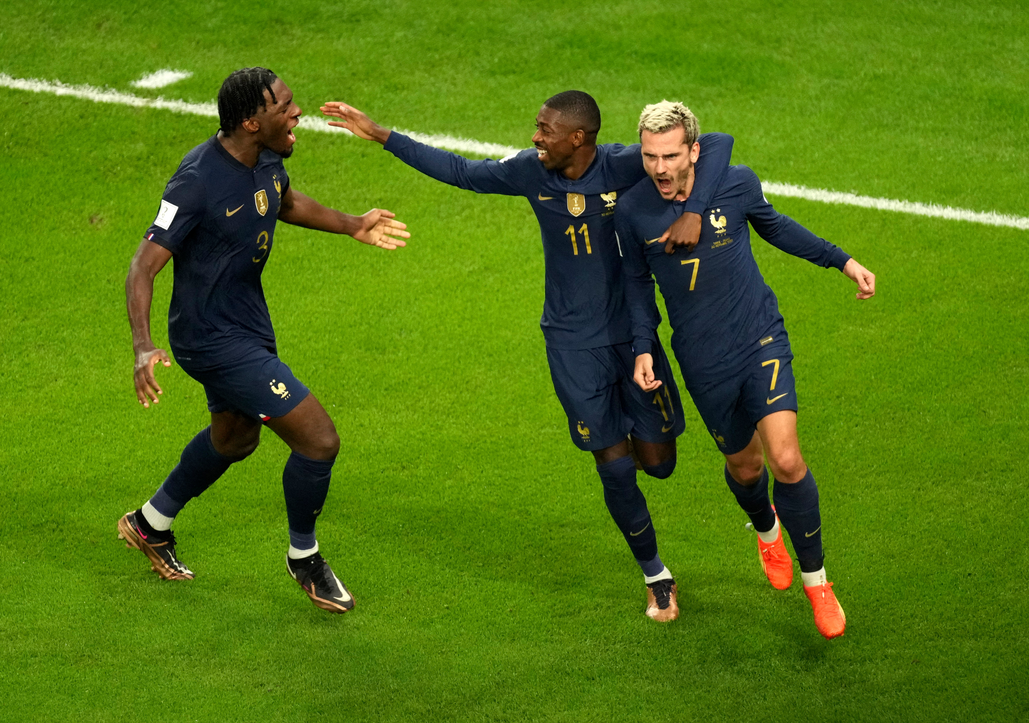 11月30日,法国队球员格列兹曼(右)在比赛中进球后庆祝。新华社记者 陈诚 摄