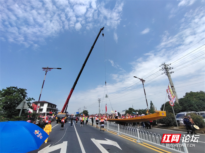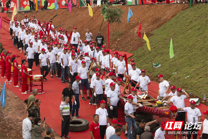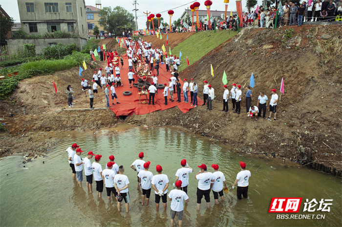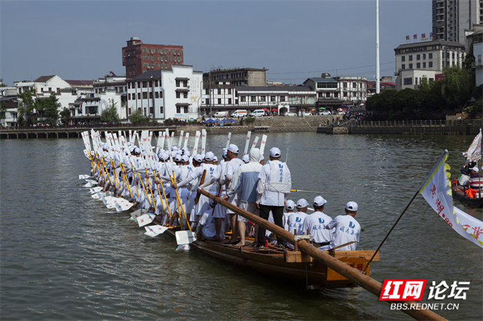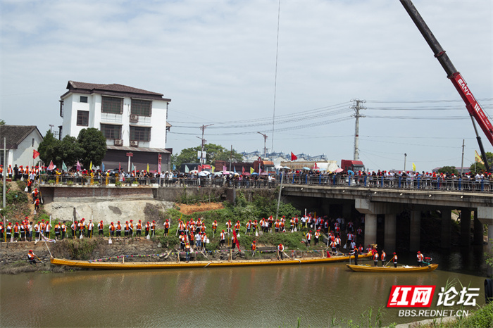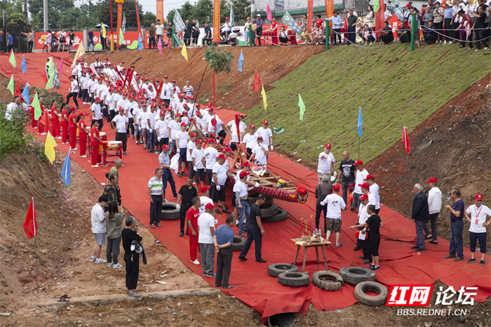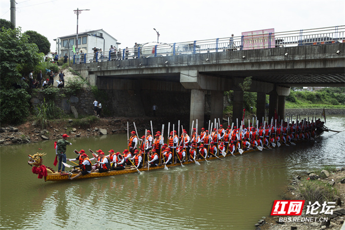 当日上午8 时左右,兰溪镇百家塅社区长约30.8米,能搭载船手118人的双挠龙船在经过游行展示和祭祀等仪式后,率先下到兰溪河中。在百家塅社区龙船成功下水后,本人和红网资深摄影网友爱海老师等几位红网网友赶赴莲花塘村,见证了该村双桡龙船下水的全过程。