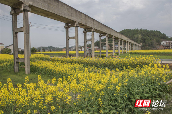 3月10日,天气晴好,我骑行电驴绕渣江镇、石狮镇、方大屋、盐田桥、高真村、花江村巡游,下午沿着在山区蜿蜒的045县道走到盐田桥村时,一架“天桥”横卧大山之间,这是灌溉水渠,从左侧往右边望去,像一条气势恢宏的巨龙,横卧大山之间,水渠下黄花遍野,不远处还有老农挥鞭赶牛犁田,这可是回老家多年不见的春耕景象啊,我情不自禁地停车拍摄,留下这珍贵的镜头。