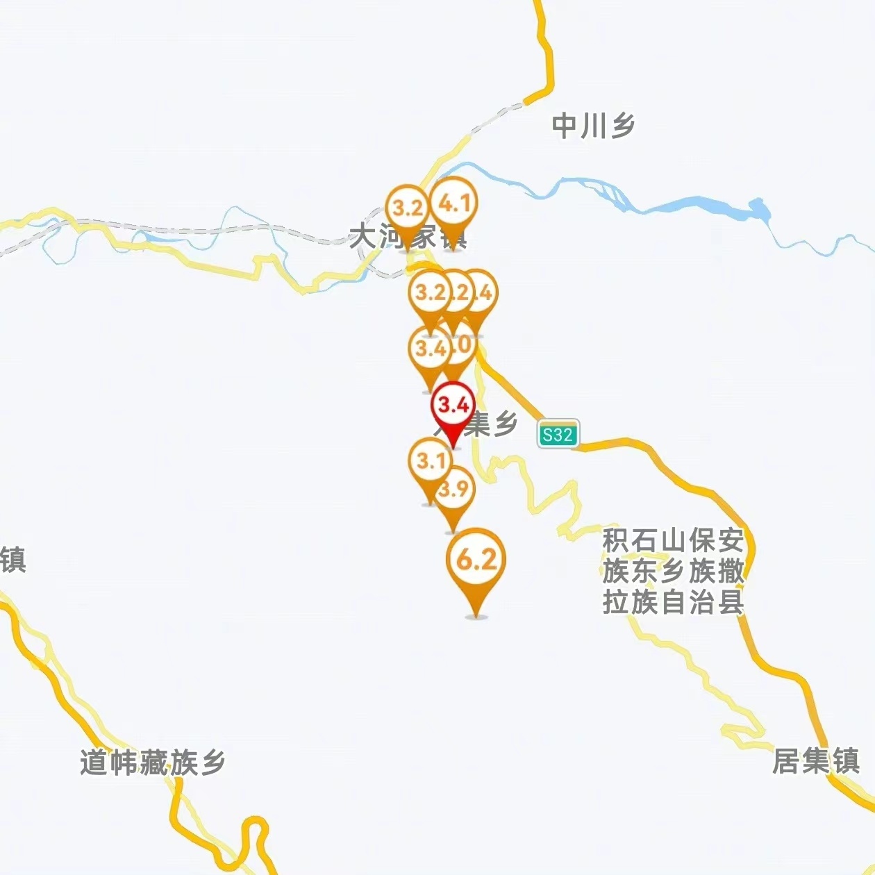 中国地震台网正式测定,12月18日23时59分在甘肃临夏州积石山县发生6.2级地震,震源深度10公里,震中位于北纬35.70度,东经102.79度。震中5公里范围内平均海拔约2787米。震中距积石山保安族东乡族撒拉族自治县8公里、距青海循化撒拉族自治县32公里、距临夏县34公里、距临夏市42公里、距永靖县53公里,距临夏回族自治州40公里,距兰州市102公里。根据中国地震台网速报目录,震中周边200公里内近5年来发生3级以上地震共24次,最大地震是本次地震。