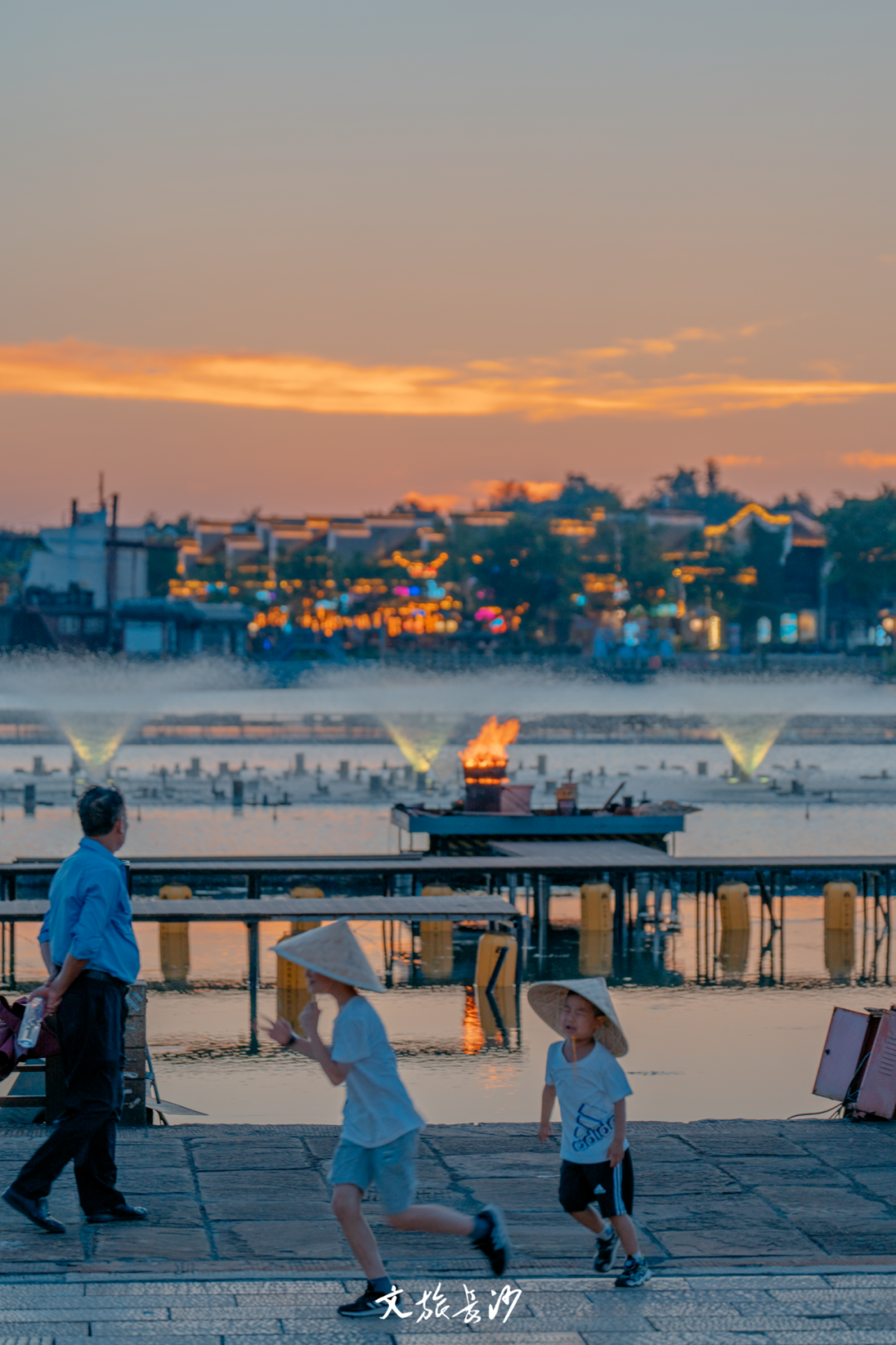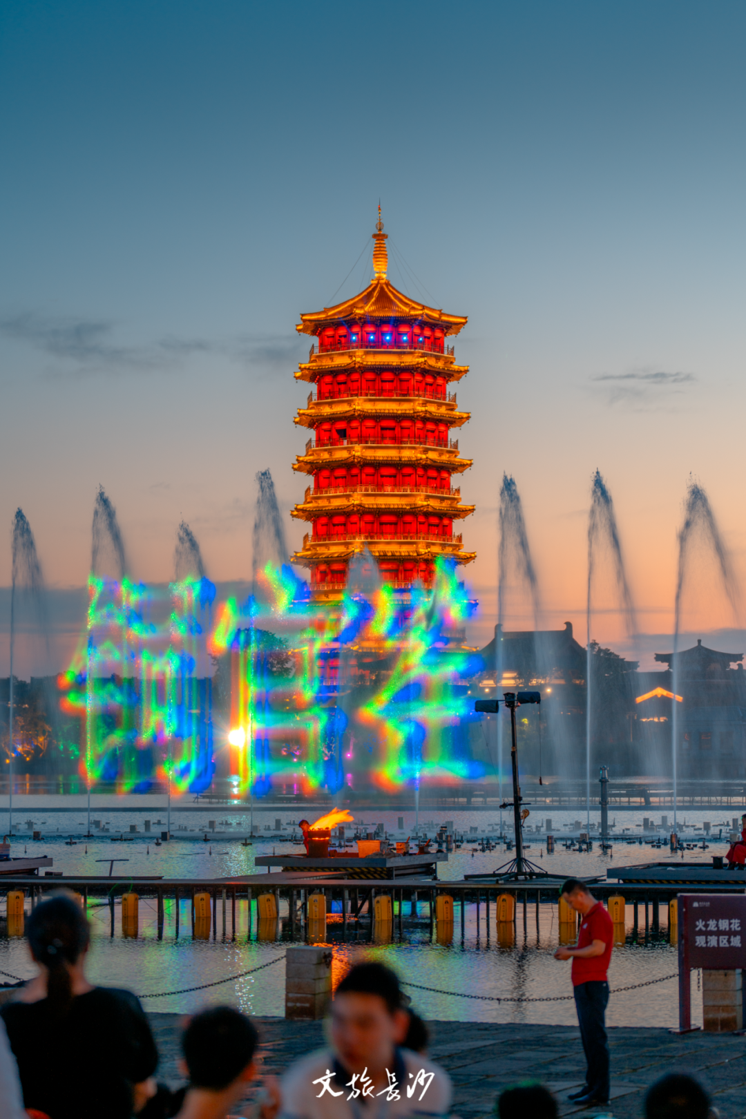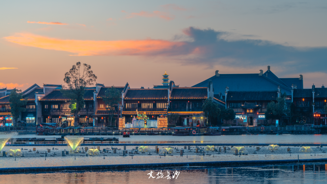此刻的铜官窑景区华灯初上,音乐喷泉翻腾的水柱输送着清凉,石渚湖边围绕着等待观赏美好的人们。