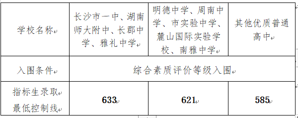 今日,长沙市教育局中招办根据“指标到校、择优录取”的原则,确定指标生录取最低控制分数线。分别划定为:长沙市一中、湖南师大附中、长郡中学、雅礼中学633分,明德中学、周南中学、长沙市实验中学、麓山国际实验学校、南雅中学621分,其他优质普通高中585分。