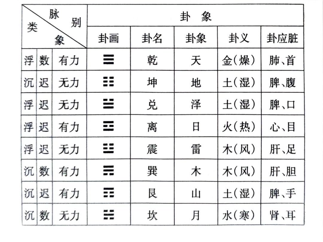 推测的方法是根据脉象的浮沉、迟数及有力、无力判断阴阳属性,以定爻成卦。正如《易・说卦》所曰:“观变于阴阳而立卦”。其中,浮、数、有力属阳,为阳爻(—);沉、迟、无力属阴,为阴爻(- -)。据此,自下而上,三爻而成卦,第二步再根据卦象作疾病的定位、定性分析。如根据《易・说卦》曰:“乾为首,坤为腹,震为足,異为股,坎为耳,离为目,艮为手,兑为口。”“乾为天,坤为地,震为雷,異为木,坎为水,离为火,民为山,兑为泽。”基本上可归纳为乾卦象肺,离封象心,坎卦象肾,艮、兑、坤卦象脾,震、巽卦象肝。离卦性属火热,坎封性属寒水,巽、震卦性属风木,坤、艮、兑卦性属湿土,乾卦性属操金,以此作为分析疾病的参考。