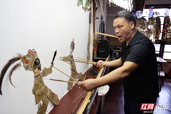 “口唱千古事,手操百万兵。四弦丝丝语,鼓磬艾艾鸣。”走进望城皮影戏博物馆,朱国强正带着徒弟表演《孙悟空大战蜈蚣精》。幕布上,西游人物在鼓声灯影中翻腾跳跃,眼眨眉动胡须飘舞,和着嘹亮的湘剧唱腔,或激昂或婉转,声情并茂地为观众们讲述着一个又一个时代的故事。