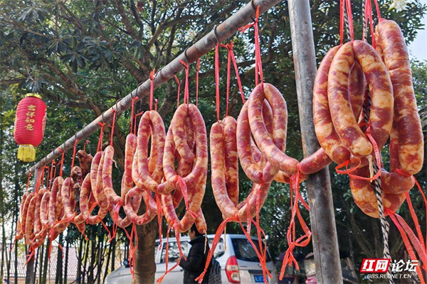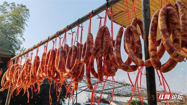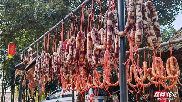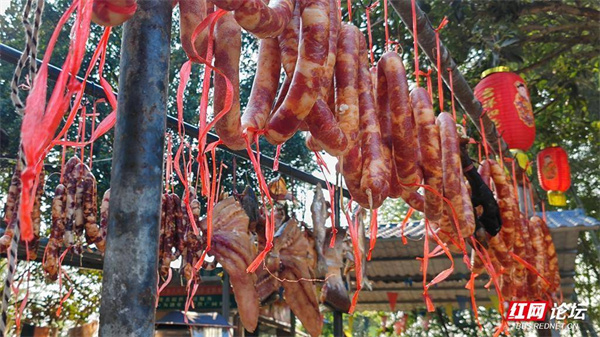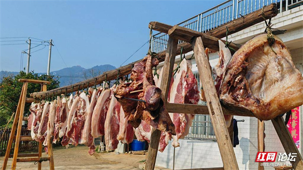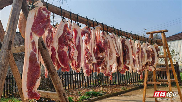 一排排腊肉整齐地铺排在木桩上,晾晒场腊香四溢。