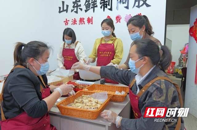 参加职业技能培训回来之后,康晓波全身心投入电商事业,刚小有起色,因为平台广告投流压力大、自身经验不足,加之刚好有孕在身,便暂停了电商事业。她在用阿胶调理身体这段时间,发现自身身体状况得到了改善,于是便加入槿上花开山东阿胶团队,学习熬制阿胶片,根据客户需求加工成阿胶糕、阿胶粉等产品,同时通过不断发展市场,越来越多的人加入她的团队中,带动新化2000多人、全国1万余人就业,目前在全国有500余家专卖店。