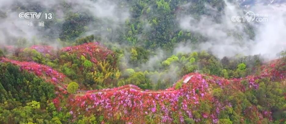 若要盼得红军来,岭上开遍映山红。映山红也叫杜鹃花,眼下,在安徽岳西县的山脊上,野生杜鹃花开得正艳,装点着一条条蜿蜒在群山间的乡村公路。春雨里,多彩的杜鹃花点缀于苍翠碧绿的群山中,在云雾中时隐时现,千姿百态、娇媚馨香,绘就了大自然里的一幅壮丽山水风景画。