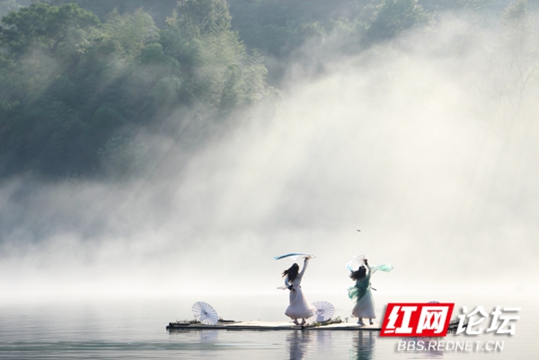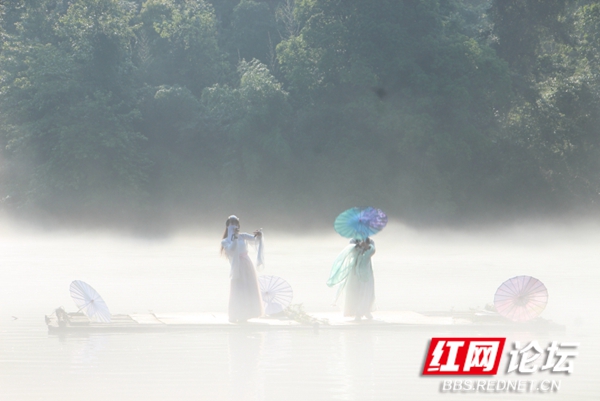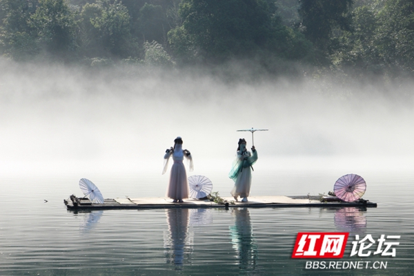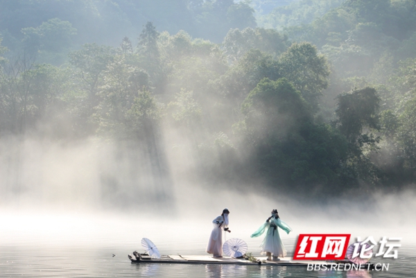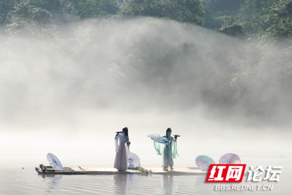 碧绿的湖水一层淡淡的白雾,几位汉服小姐姐们泛舟湖上,荡起微波粼粼,犹如仙女下凡。
