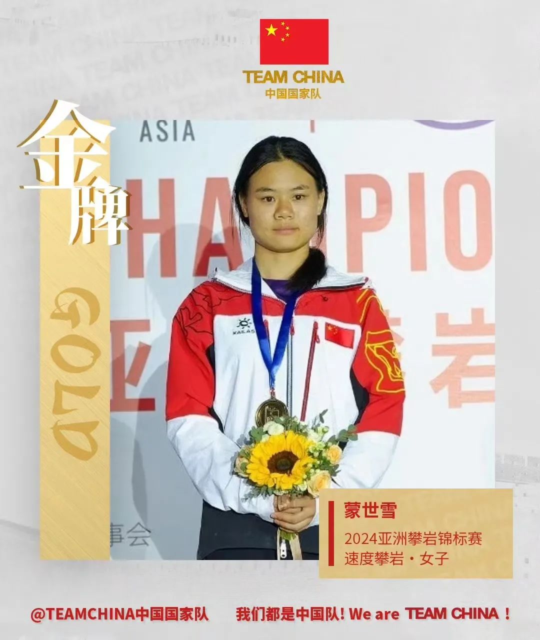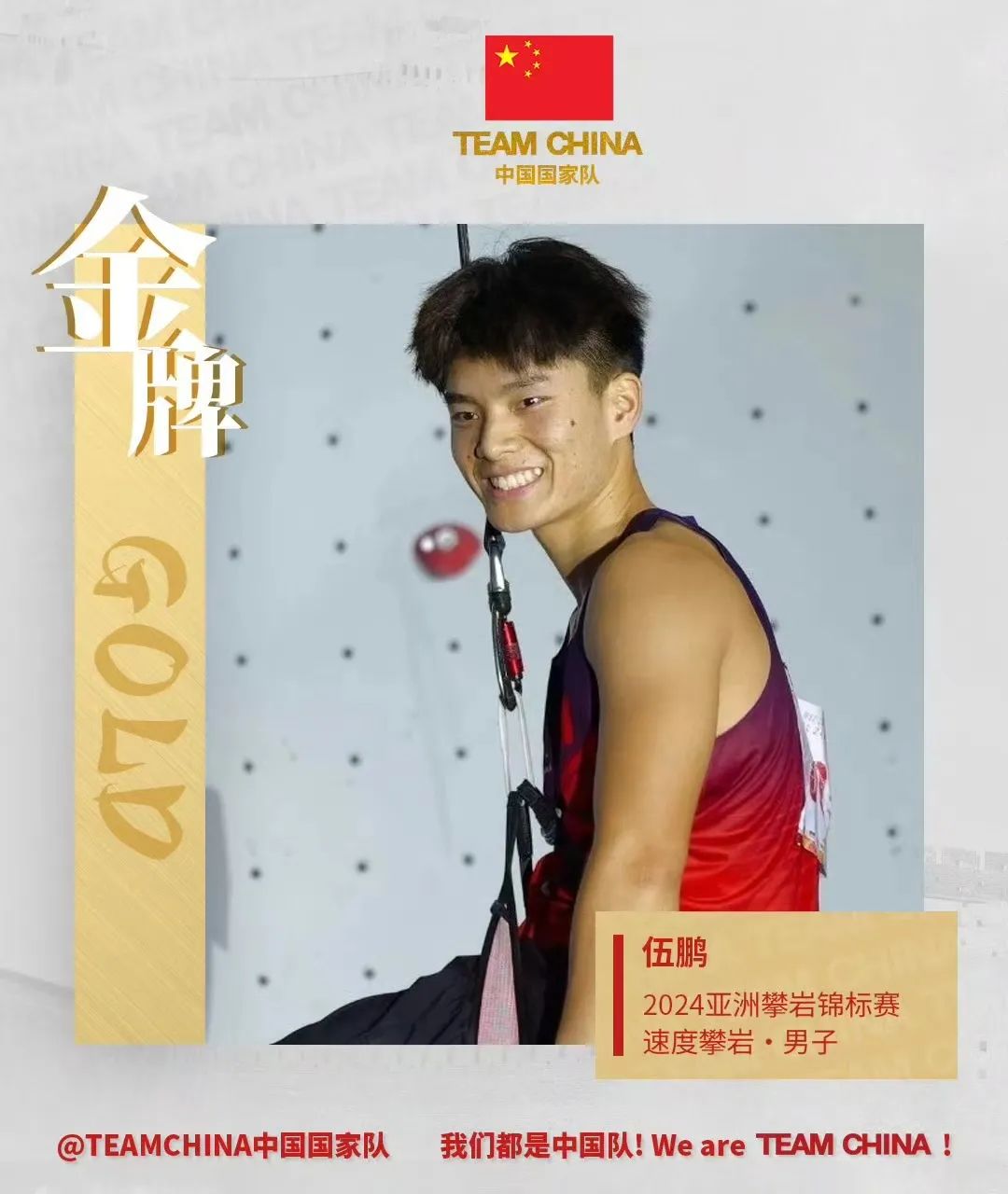 10月13日,2024亚洲攀岩锦标赛速度攀岩比赛完赛。中国选手伍鹏、蒙世雪分别夺得男子、女子项目冠军,这也是两人的首个亚洲冠军。