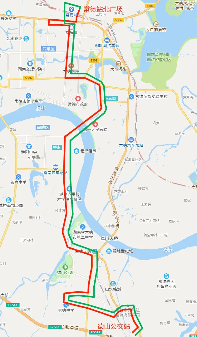 取消站点:柏园桥、丹阳路口(洞庭大道)、市十一中学、农业发展银行、金色晓岛、电信新村、芷兰小区、华达幸福湾、市公路局、火车站、常德汽车总站、公交总站