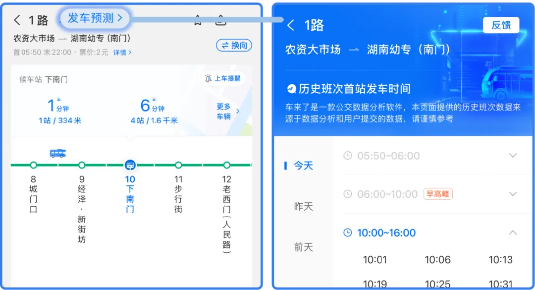 车来了APP结合历史发车和实际路况,精准计算发车时间,等车查班次更全更准;更有全天发车时刻表展示,再也不怕错过公交车啦~