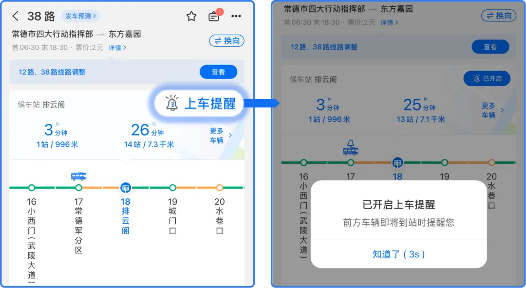 车快到站可设置上车提醒;接近目的地可设置下车提醒,以便市民提前为上下车做好准备。